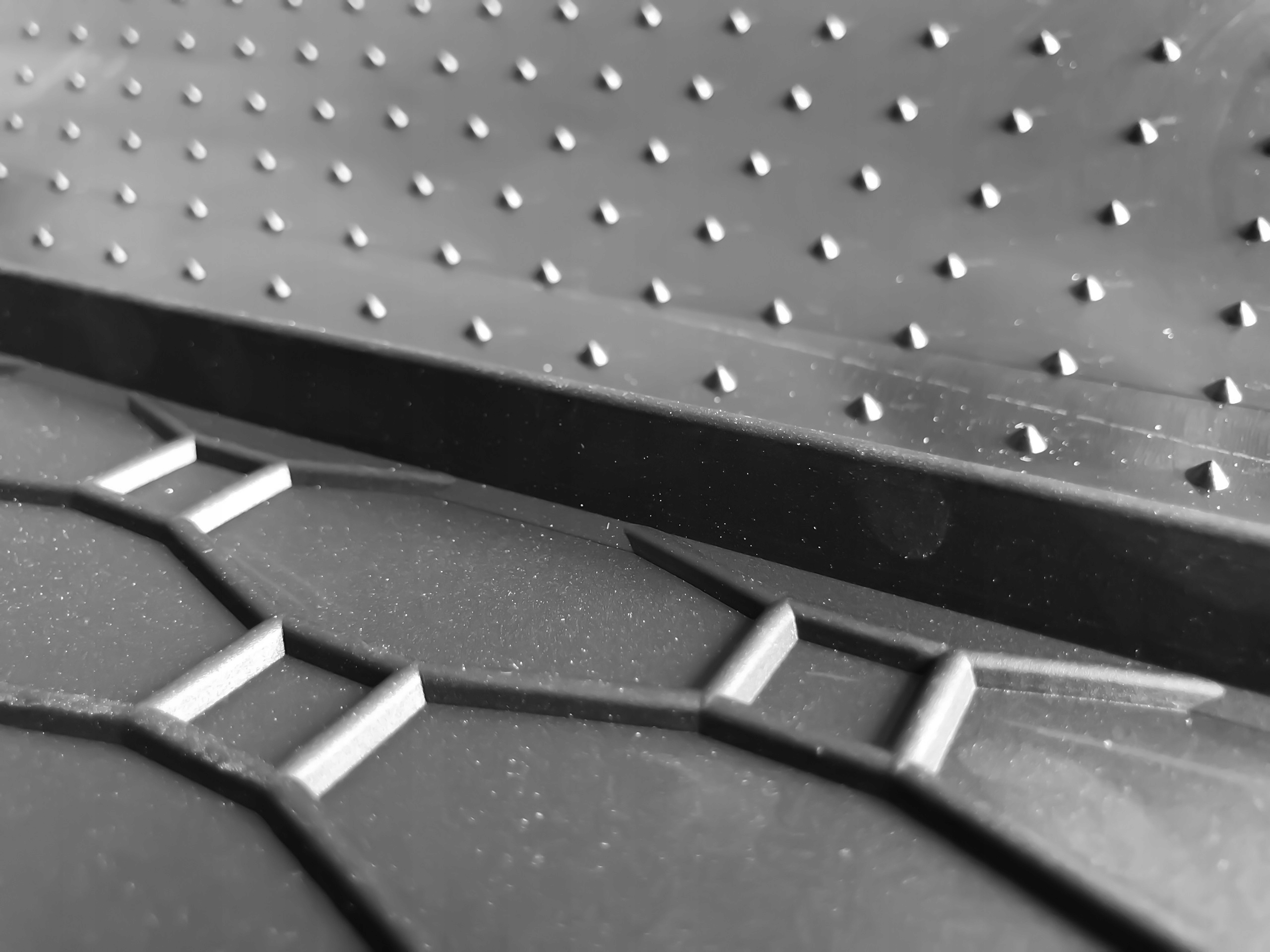 - ТИСНЕННЯ: рельєфне зображення моделі автомобіля в центральній частині килимка та тиснення моделі автомобіля з логотипом виробника в нижній частині.