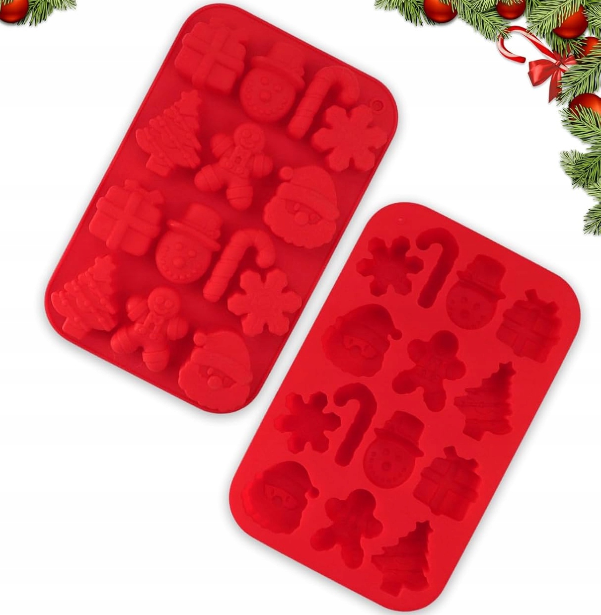 силіконові цвіль у святкових візерунках для виготовлення домашніх шоколадних цукерок та солодощів із порожнинами у формі: l цукрова дупа, сніговики, подарунки, ялиці, мрон та голови Санти. Продукт також призначений для для створення желе або кубиків льоду.