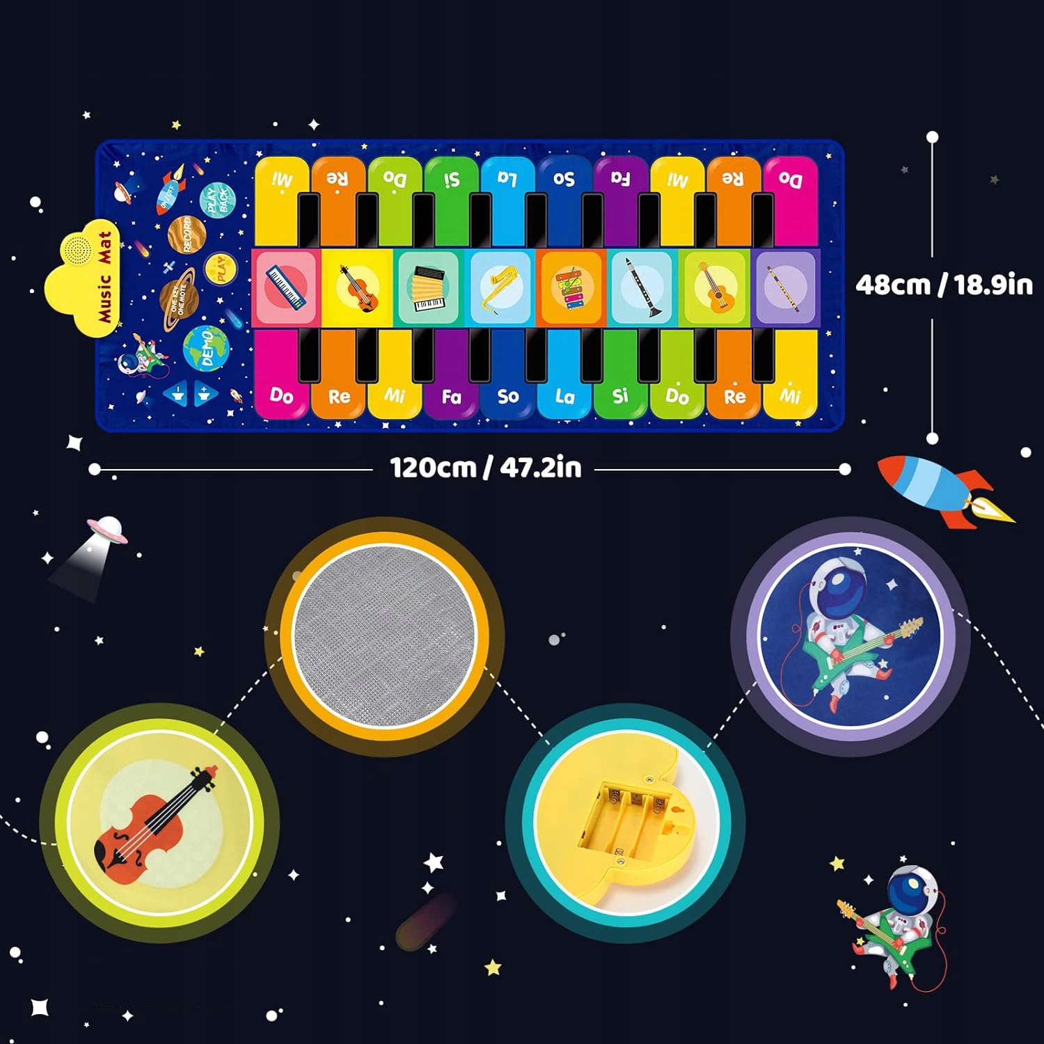 🎹🎹 【【Нова конструкція з 35 звуками】 для дітей має нову подвійну конструкцію клавіатури. З 8 інструментами, 10 римами та 20 тактильними клавішами фортепіано, багаті звуки змусять дітей насолоджуватися та розважати! Танцювальний килимок з фортепіано має 5 режимів функцій, які дозволяють дітям відчувати нескінченну творчу забаву. Розміри: 120х48 см.