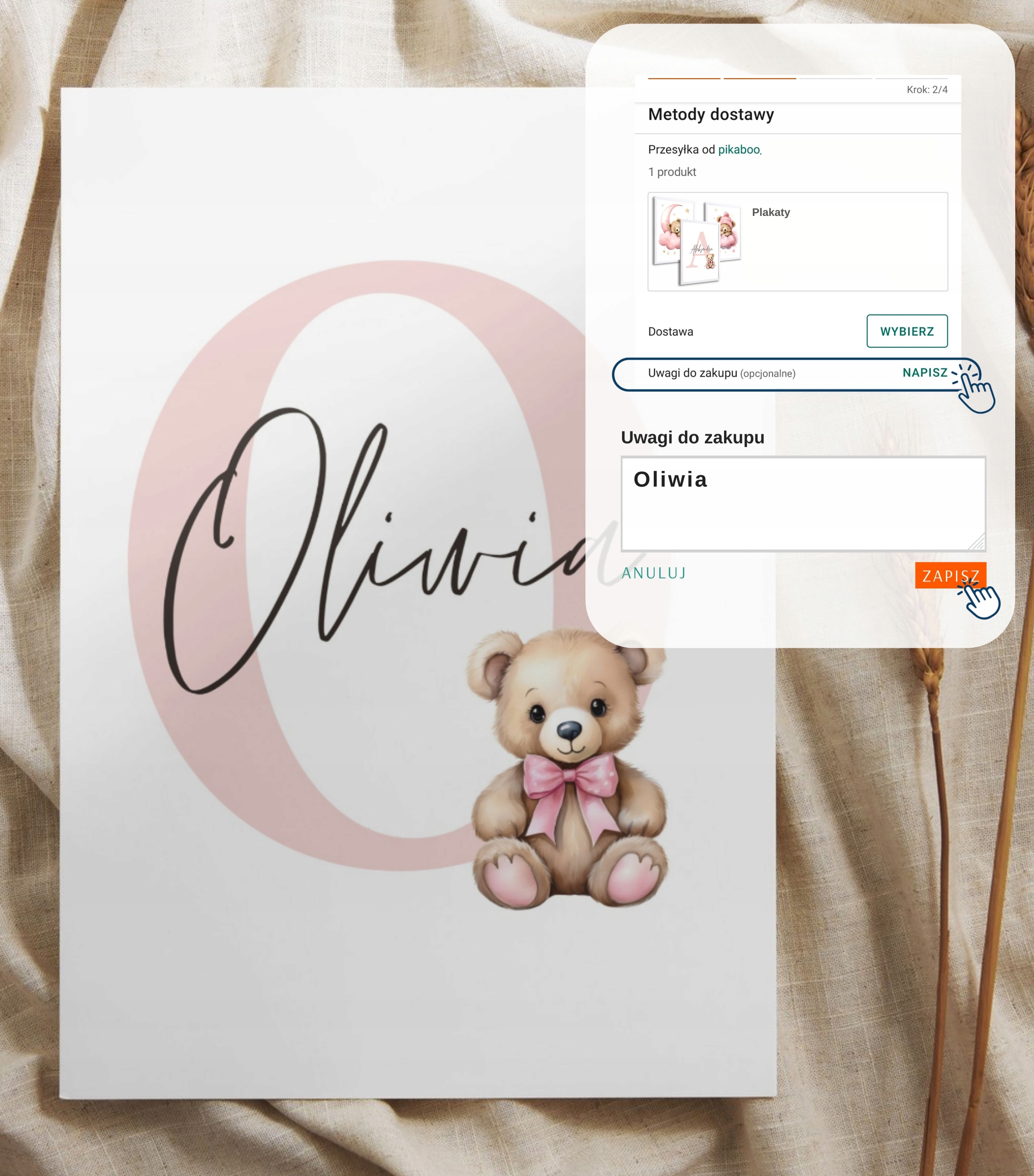 - персоналізованим плакатом , на якому ім'я дитини -це великий акцент, який змусить кімнату приймати особисту, унікальну унікальну персонаж. Підкорені, пастельні кольори в відтінках рожевого, бежевого та білого введуть тепло, гармонію та затишку в інтер’єр. Безпечні чорнила без запаху гарантують, що прикраса буде повністю безпечною. Сатиновий папір, призначений для професійних роздруківки, ідеально забезпечує відтворення кольорів та довговічність плакатів. Персоналізовані настінні прикраси також є унікальним способом подарунка для батьків, які цінують унікальні, сповнені почуттів.