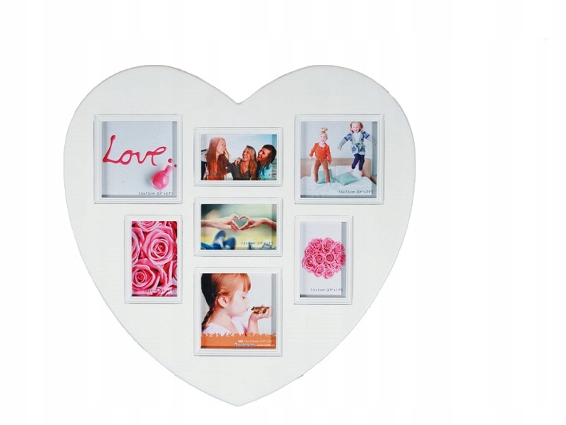 Пластикова біла рамка у формі серця, що дозволяє розмістити 7 фотографій різного розміру (3 фото 8х8 см, 4 фото 5х8 см). Рамка створює дуже романтичну атмосферу в інтер'єрі кімнати. Додаткові елементи дизайну, такі як чорні потертості навколо фотографій, створюють чудовий візуальний ефект.