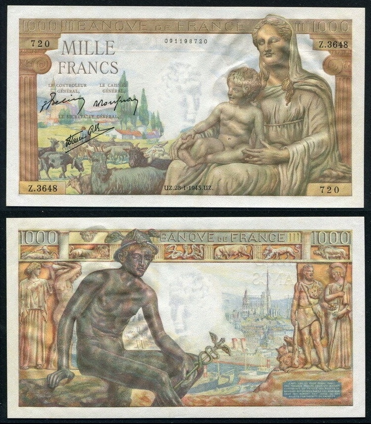 FRANCJA 1000 Francs 1943 P-102 UNC