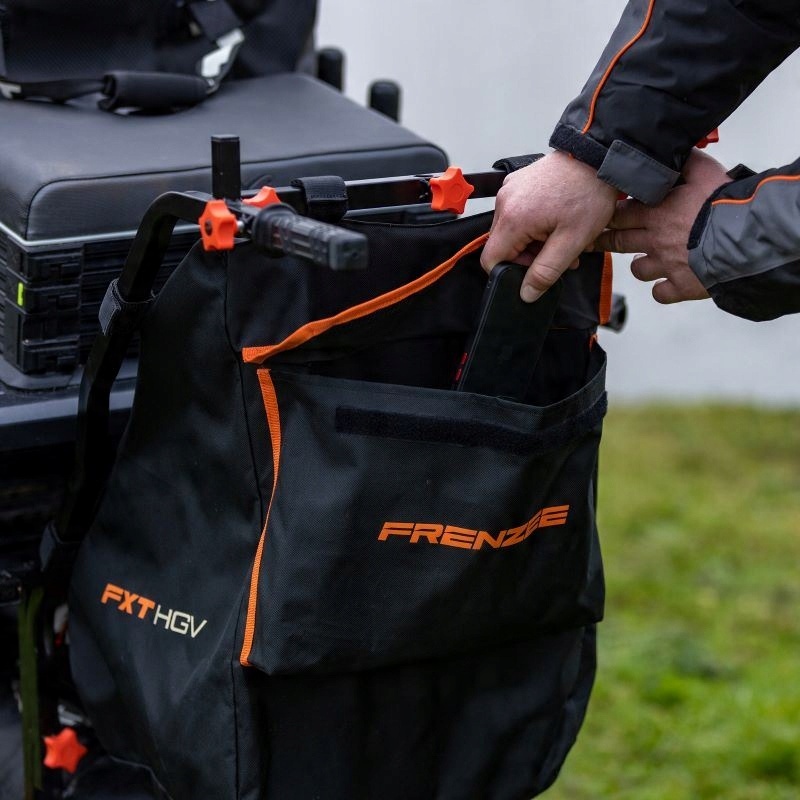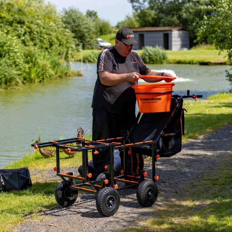 Великий візок, у якому поміститься все ваше обладнання! Frenzee має дворівневу систему зарядки! Ви можете завантажити сумку для вудилищ на нижній рівень, щоб мати швидкий і легкий доступ до вудилищ, не турбуючись, що багаж з верхнього рівня роздавить її. Довжину коляски можна регулювати. Ручки можна розташувати вертикально або горизонтально. У комплекті з коляскою є велика сумка, яка розміщується на спинці коляски, і кільце для відра.