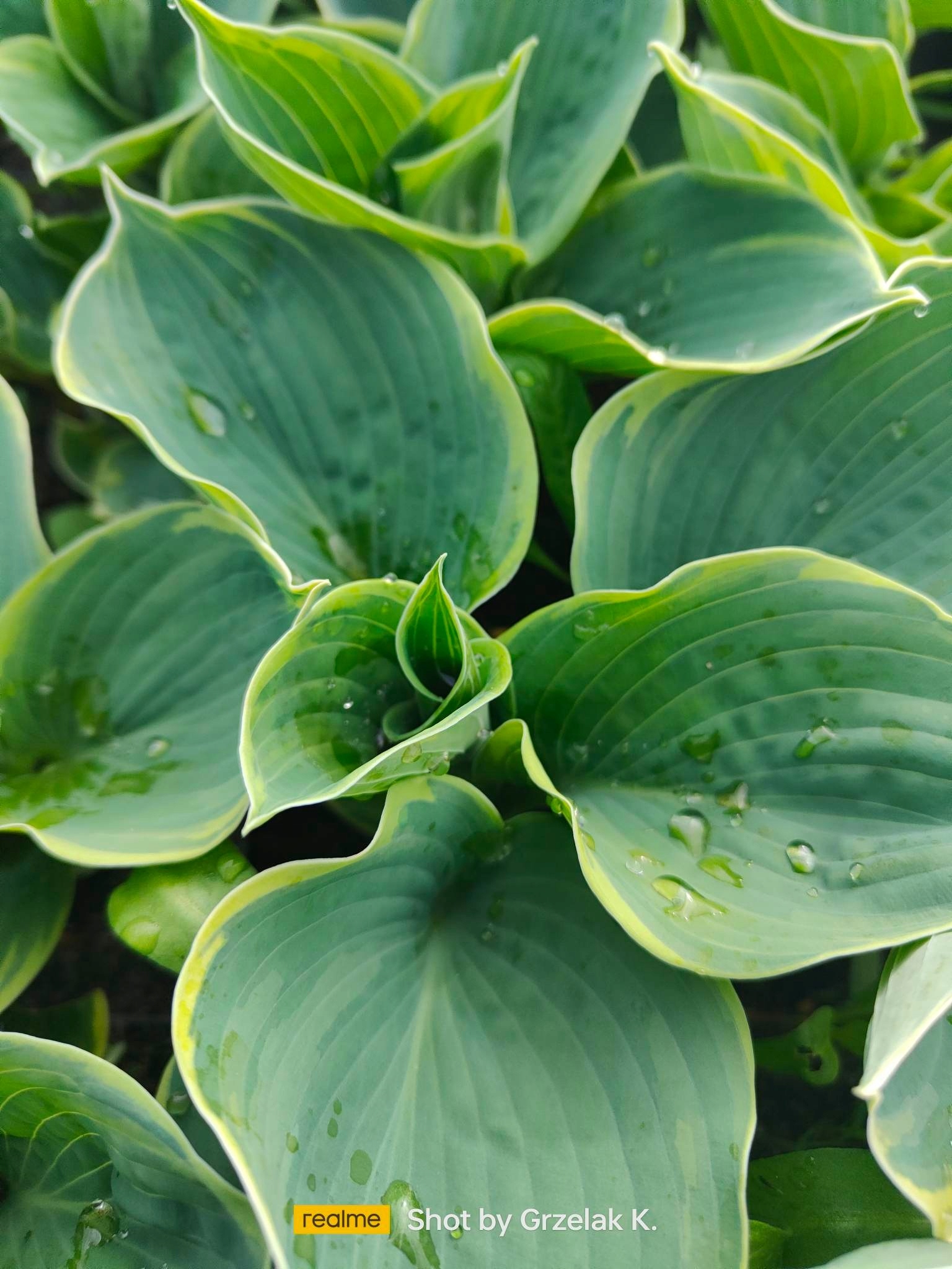 Середній/Великий. Він досягає 50-60 см у висоту і приблизно 100 см в ширину. Листя виїмчасті, овальні, матові синьо-зелені з нерівномірним кремовим краєм. Лаванда і білі квіти. Від півтіні до тіні.