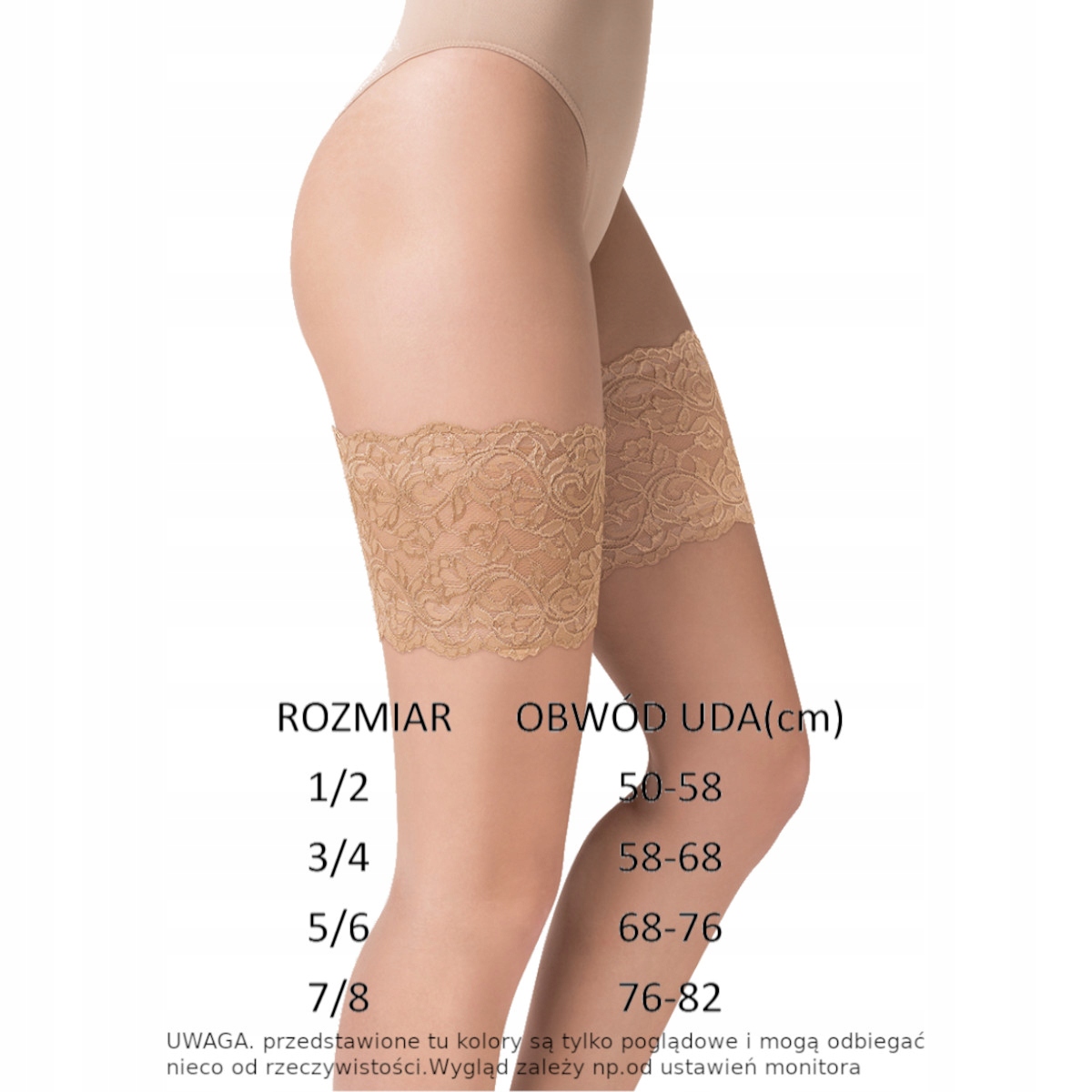 Самотримаюча декоративна пов'язка на стегнах - модна альтернатива колготкам або панчохам для спекотних літніх днів. Широкий (15 см) мереживний пояс із силіконовими смужками з внутрішньої сторони утримує стегнову стрічку на місці. Мереживна стрічка на стегнах забезпечує комфорт і зручність носіння, запобігає потертості і почервоніння, при цьому ефектно прикрашає ногу.
