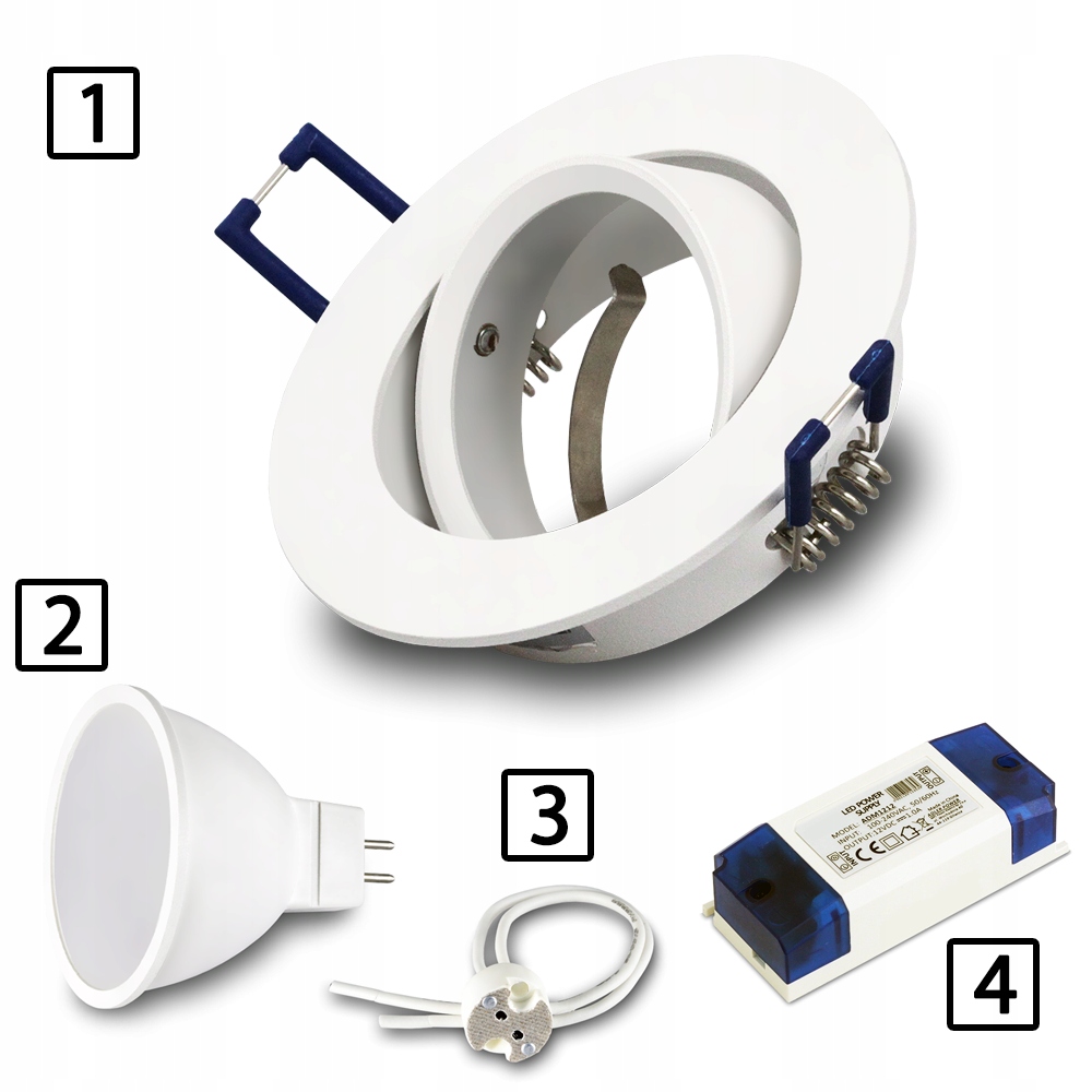 Щоб отримати повний набір освітлення, ви повинні придбати лампочку GU10 і тримач лампи (версія 230 В) або лампа Gu5.3, тримач лампи та блок живлення світлодіодів (версія 12 В). Нижче ми покажемо, як має виглядати такий набір.