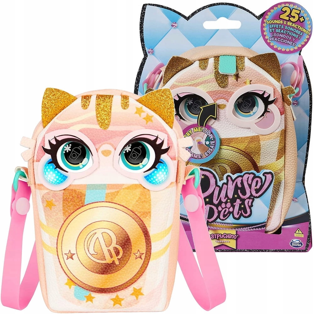Катпучіно - це солодке, беге -кошеня, схоже на фрап і має блиску. У сумці є великі очі з довгими війами та освітленими щоками.