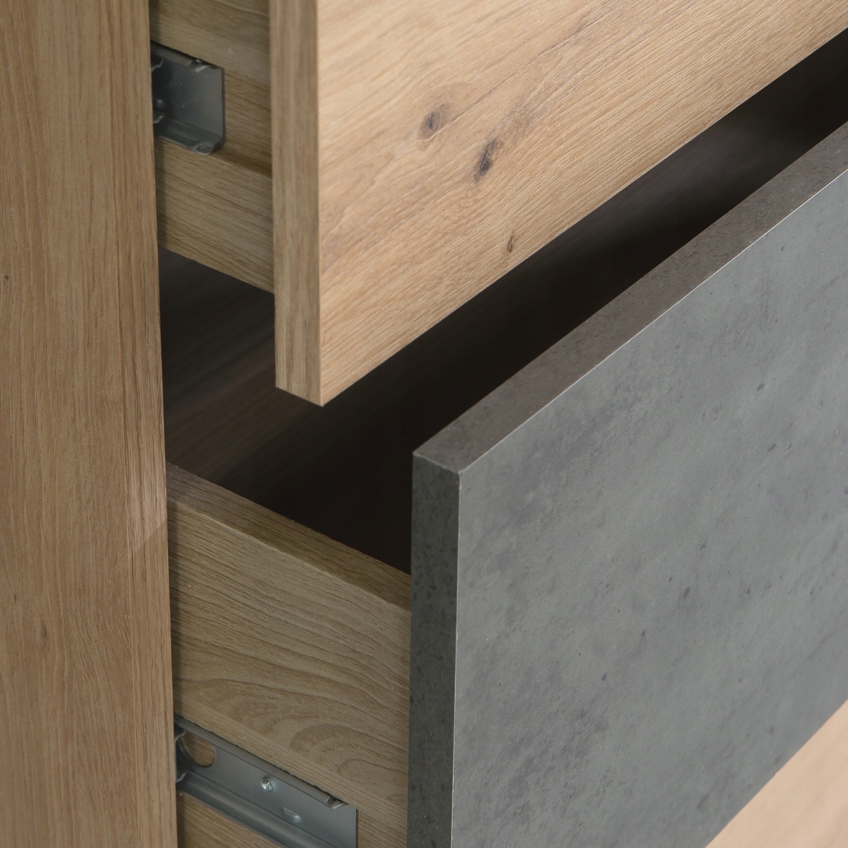 комоди з колекції Skive у вражаючому поєднанні деревини та бетонного кольору - це стильний та функціональний предмет меблів для сучасних інтер'єрів. Виготовлений з довговічної меблевої тарілки, стійкої до пошкоджень і простих у чистому, гарантує довгострокове використання. Його інтер'єр практично організований з ящиками та закритими поглибленнями, що дозволяє зручно зберігати текстиль, одяг та невеликі аксесуари. Комод -скриня оснащені ергономічними ручками, які полегшують доступ до вмісту без ризику бруду фронтів. Додатковою перевагою є просторий верх, ідеально підходить для демонстрації прикрас чи сувенірів.