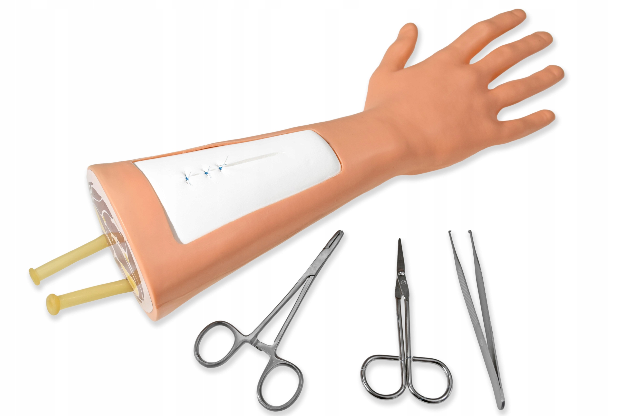 Реалістична модель складається з панелі для навчання хірургічного зшивання і панелі длянавчальної ін'єкції, які розміщені на одному «пацієнті» - реалістичній моделі передпліччя.