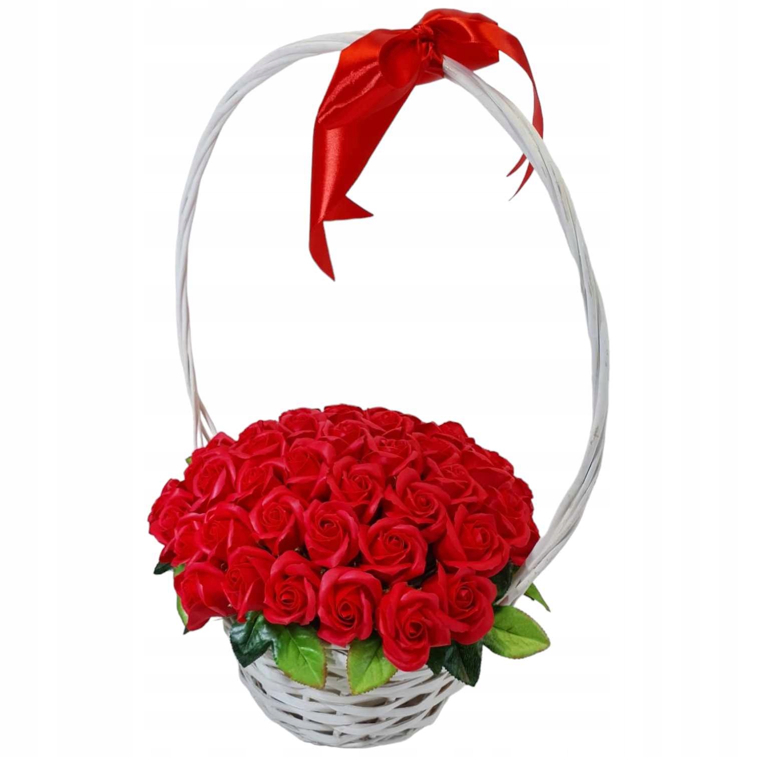 Красивий великий кошик з 50 трояндами на річницю весілля, день народження, п'ятдесятиріччя з червоними мильними трояндами, можливість індивідуального вибору кольору.