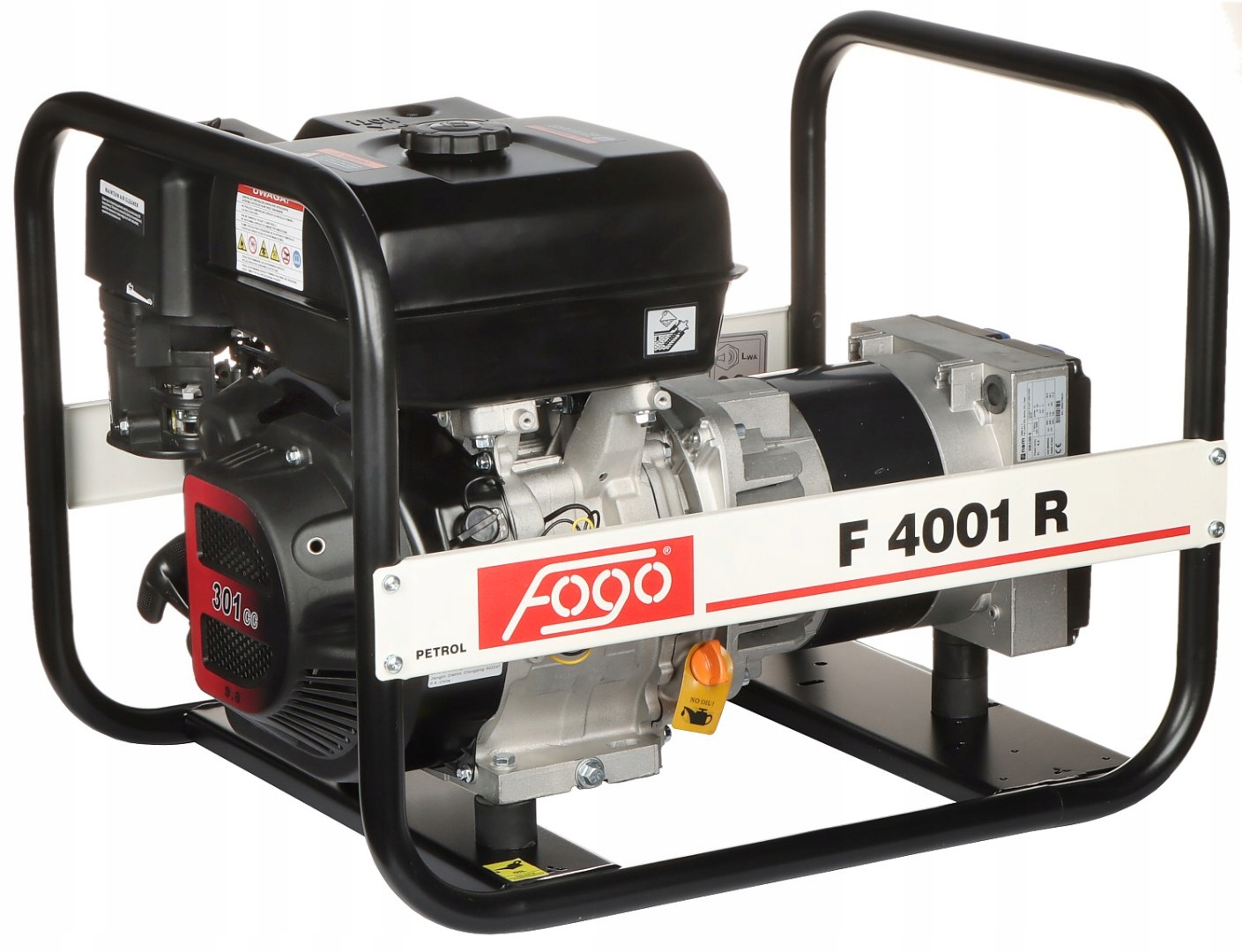Генератор живлення Fogo F 4001 Привід генератора -це двигун бензину Rato R300 Rato R300 з ручним стартом. Пристрій належить до серії AVR з електронним регулятором напруги, тому він в основному рекомендується при постачанні пристроїв, таких як комп'ютер, зварювальна машина, освітлення, електрична плита тощо. F 4001 R агрегат оснащений синхронним генератором із ступенем захисту IP23, і, таким чином, захищається від випадкової штриху та розпорошення води на будь -який кут до 60 -ти градусів. У машині є два однофази 16 розетків, захист перевантаження та датчик рівня масла. Сукупний паливний бак має потужність 5,4 л, а спалювання при 75% навантаження - 2,2 л/год.