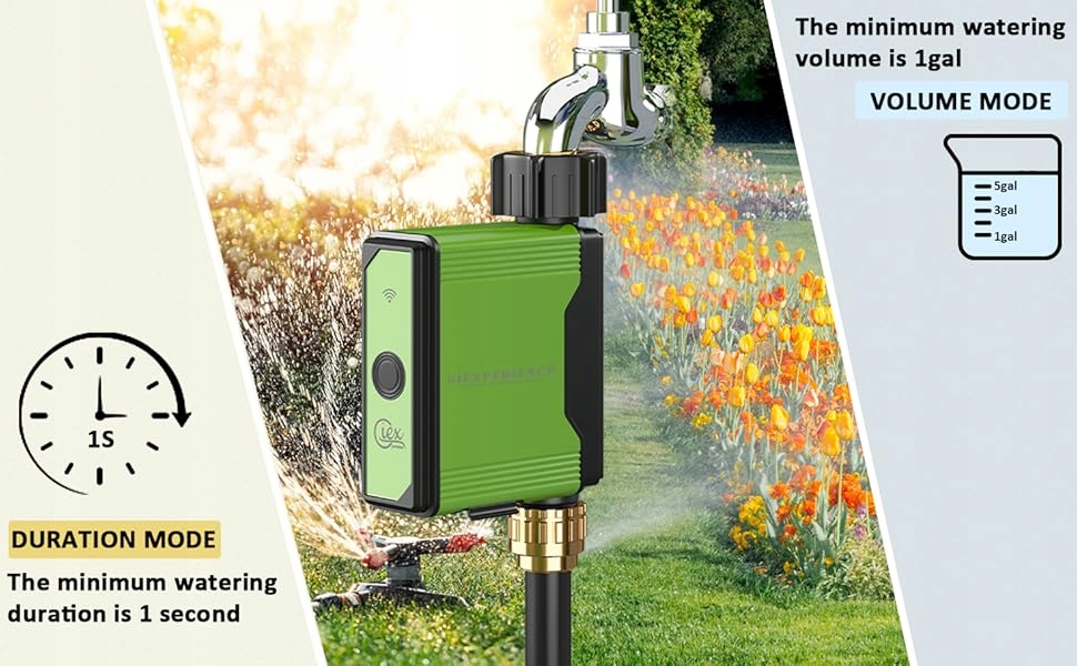 Цей продукт пропонує два режими зрошення: тривалість та об'єм. На відміну від багатьох конкурентних продуктів, які підтримують лише зрошення на основі часу, з мінімальною тривалістю 1 хвилину, наш продукт дозволяє точно контролювати з мінімальним часом зрошення лише 1 секунди. Крім того, мінімальний об'єм поливу може бути встановлений на 1 галон (приблизно 3,8 літра), що забезпечує більш точне та ефективне зрошення.