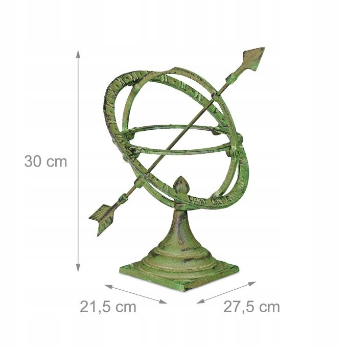 Якщо ви хочете прикрасити свій сад справжньою декоративною мелодією, ці сонячні годинники ідеально підійдуть. Годинник у старовинному стилі має цікаві деталі та зелену патину, яка надає прикрасі саду особливого старовинного вигляду. Напис добре поєднується з римськими цифрами. Основа забезпечує стабільне положення. Він має попередньо просвердлені отвори для легкого встановлення на підлозі.