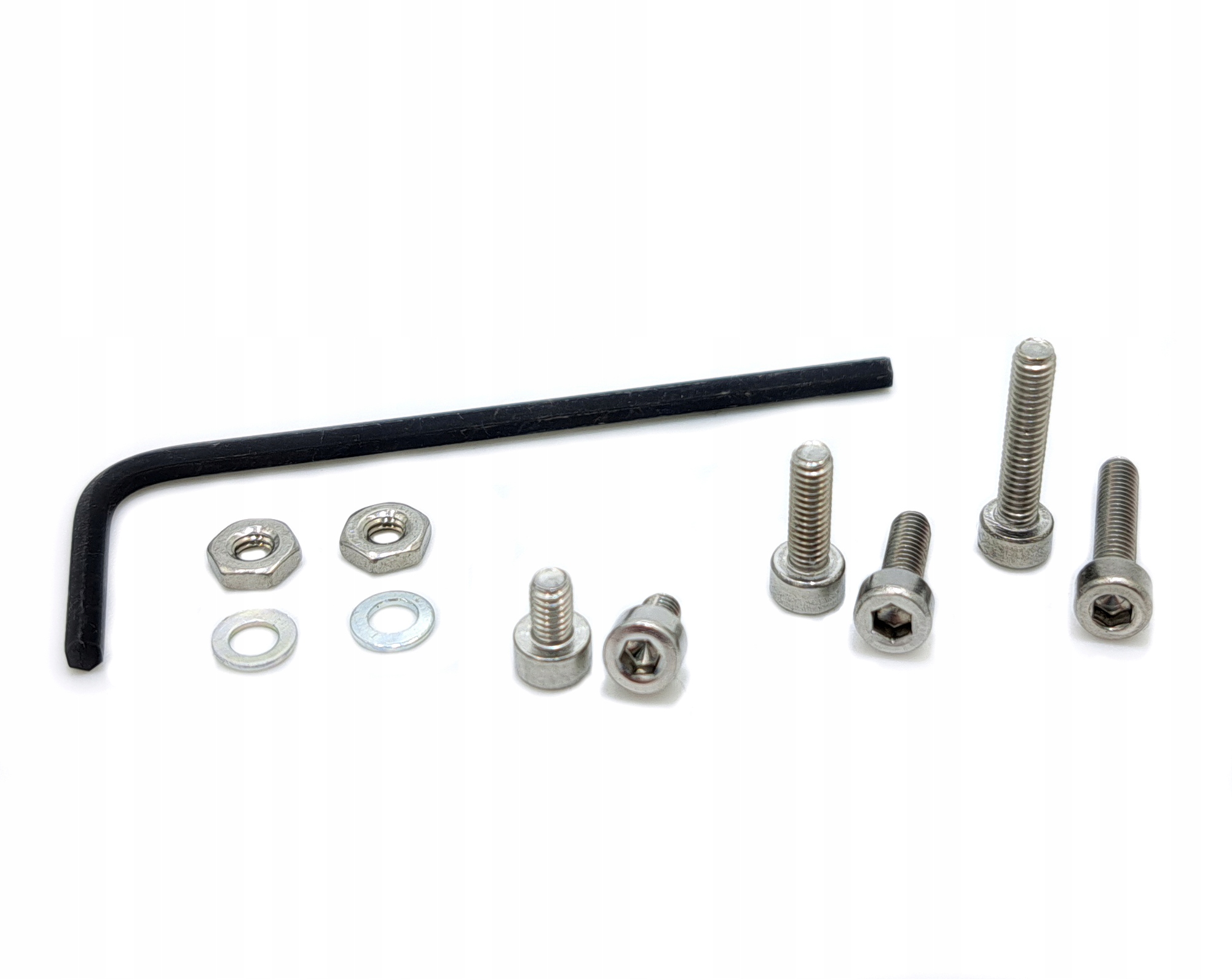 Повний набір гвинтів, призначених для встановлення вставки поворотного столу в головну шкаралупу. Він містить три пари гвинтів з довжиною: 6 мм, 10 мм і 14 мм, з належним чином відповідними нитками: 4 мм, 8 мм і 12 мм. Крім того, набір включає дві прокладки та два гайки, що дозволяє суцільно і точно приєднати вставку - незалежно від типу руки або головної мушлі.