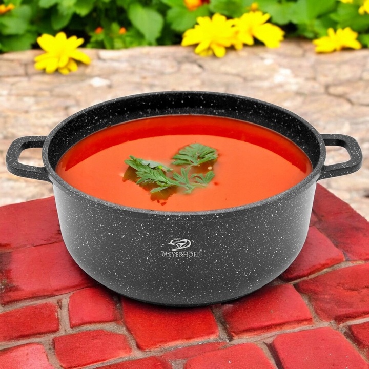 Суцільний горщик виготовлений з найвищої якості алюмінію, покритий мармуровим антипригарним покриттям . Продукт характеризується простотою виготовлення , і належним чином профілювані краї дозволяють безпосередньо злити рідини з судна без несподіваного бризки. У ньому є зручні ручки , які забезпечать стабільну та захищені зчеплення під час його перенесення. Ідеально підходить для підготовки різних видів страв. Спеціальне феромагнітне дно підходить для всіх видів плит: газ, електрична, керамічна, індукція та галоген.