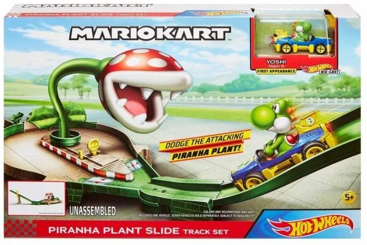 Кожен набір включає суперника та копія металевого транспортного засобу Mario Kart, у якому діти долають перешкоди та стикаються з випробуваннями – як у грі, але цього разу на трасі Hot Wheels!