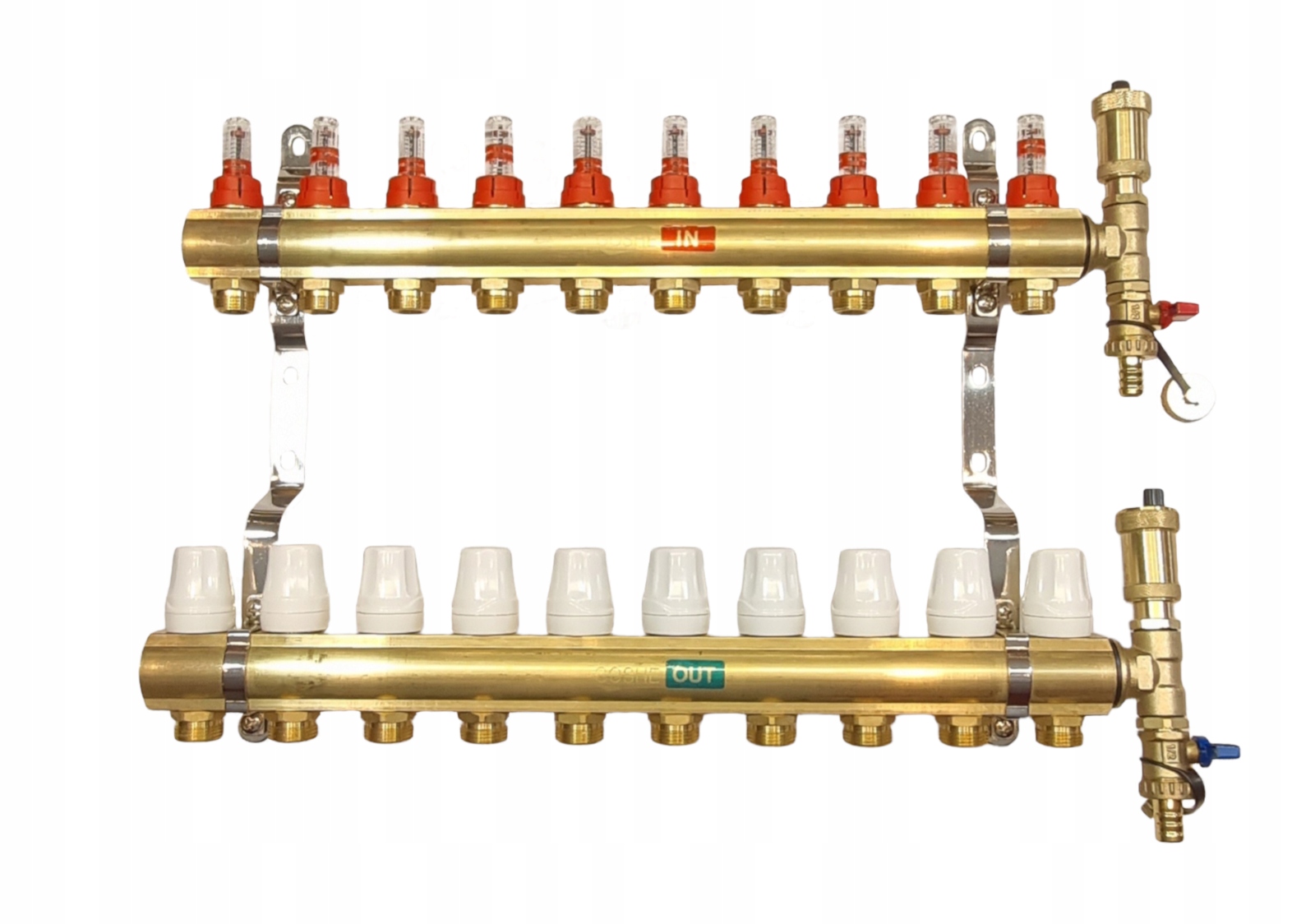 Латунний розподільник використовується для поділу теплоносія на окремі нагрівальні секції. Балки кріпляться на кронштейнах. Вони оснащені: вентиляційним і дренажним комплектом.