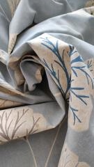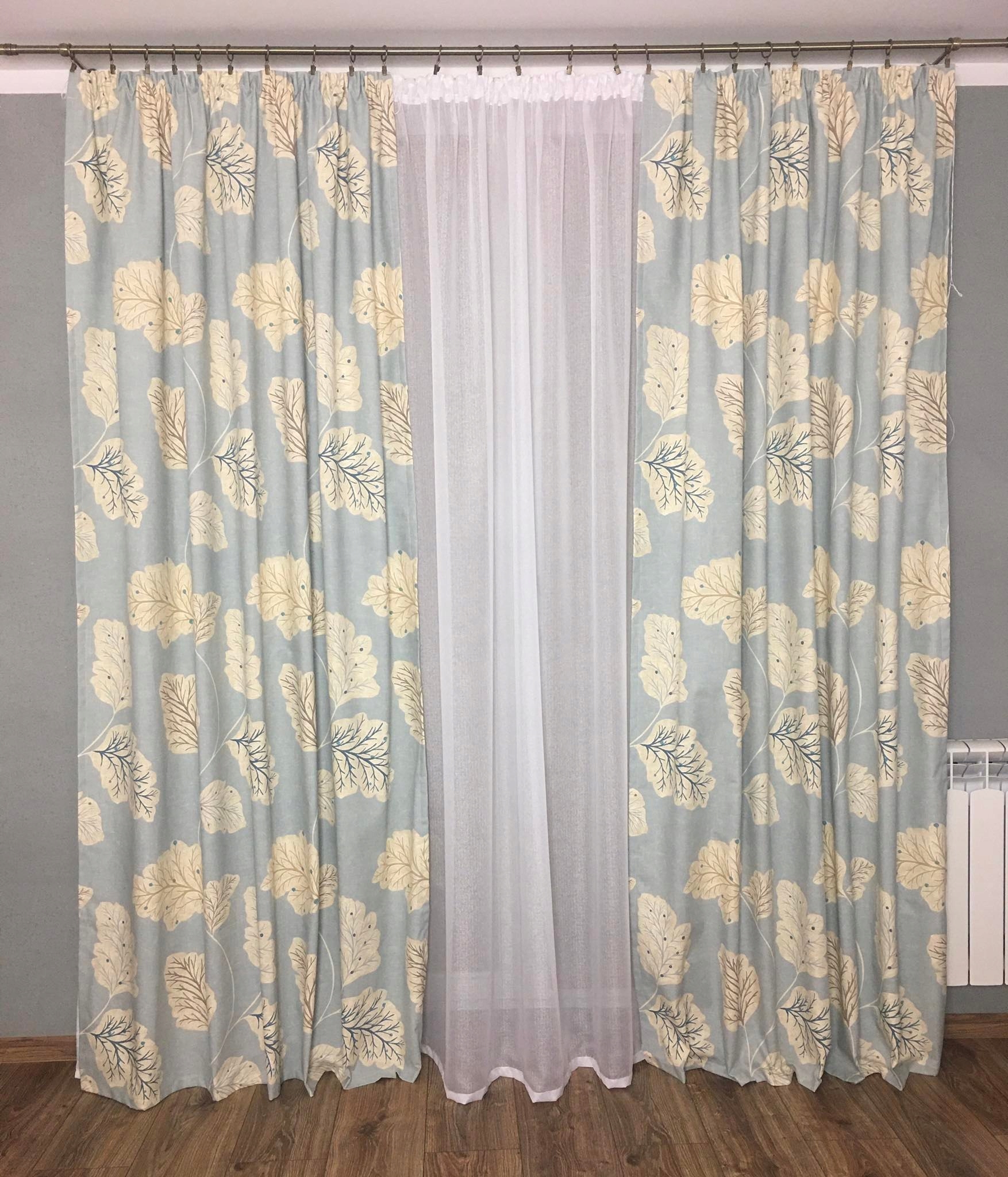 Сучасна штора готова на збірну стрічку з візерунком листя на блакитному тлі.