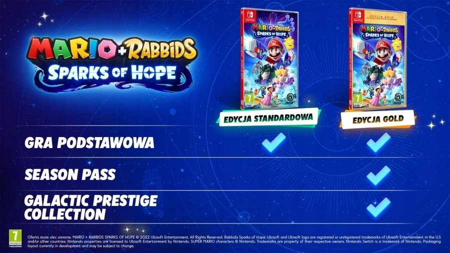 Приєднайтеся до команди з Маріо, Луїджі, Принцесою Піч, Кроликом Піч, Кроликом Луїджі та їхніми друзями, щоб разом вирушити в космічну подорож, перемогти зловісну істоту та врятувати Іскорки. Досліджуйте планети по всій галактиці та відкривайте унікальні секрети та захоплюючі місії!