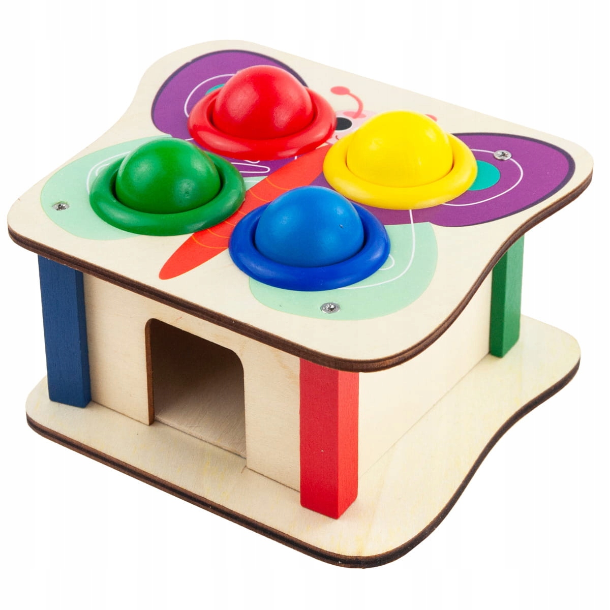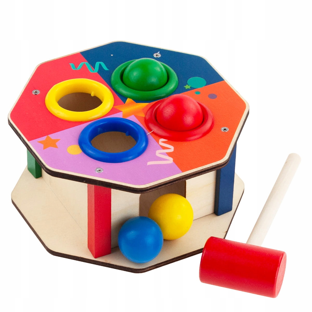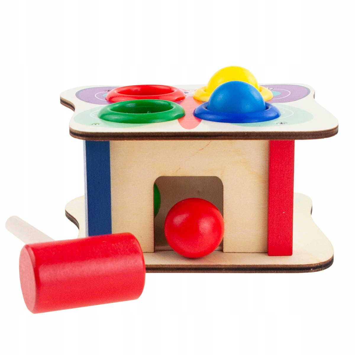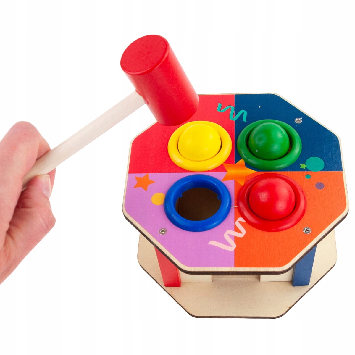 Фантастична іграшка для дітей, у якій можна відбивати різнокольорові кульки молотком. Дерев'яна гра з ударом - це не тільки джерело великого задоволення, вона також допомагає розвивати зоровий і моторний рух і підвищує точність. Використання молотка допомагає тренувати ручні навички, які надзвичайно важливі, коли дитина дорослішає після року. Простий дизайн, оброблений різнокольоровими обідками, впливає на естетику всього виробу, що робить іграшку ідеальною для подарунка.