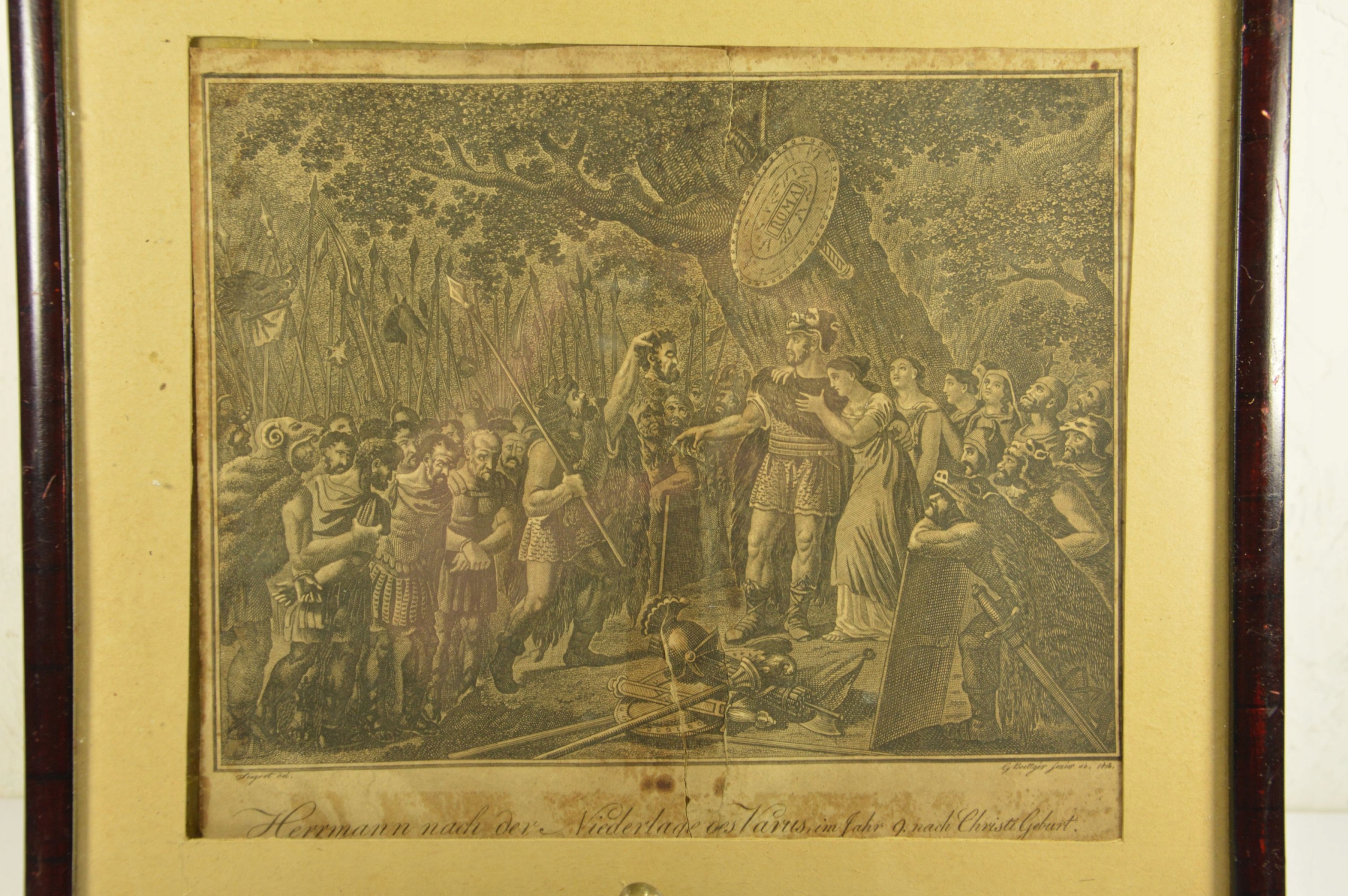 Оригінальна графіка 19-го століття від Готліба Беттгера старшого – Поразка Варуса 1816. Графіка добре збереглася, внизу видно довгу розрив. 5 см. Пізніша рамка, вільна з лівого краю.