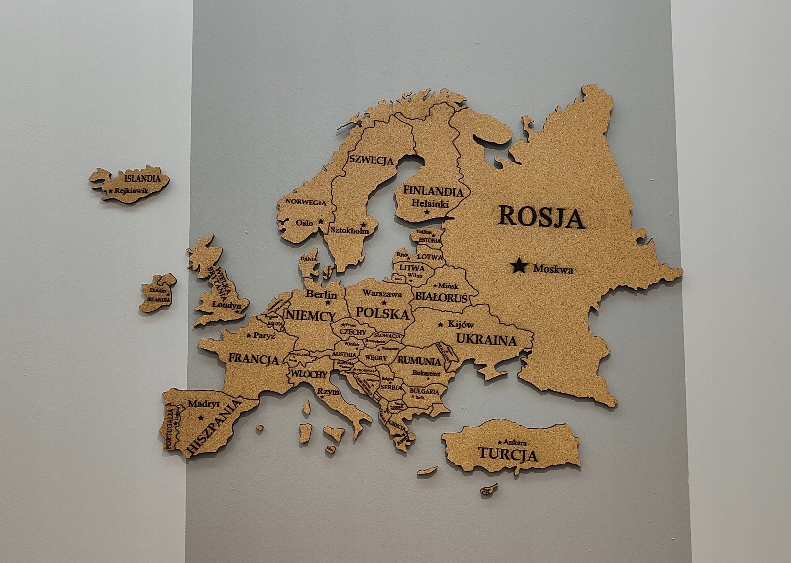 Крім того, для полегшення монтажу ви отримуєте шаблон із 3-міліметрової плити HDF. Він стабільний. Ви розміщуєте шаблон на стіні і по черзі «вставляєте» в нього окремі елементи. Потім ви акуратно знімаєте шаблон і у вас на стіні готова карта Європи.