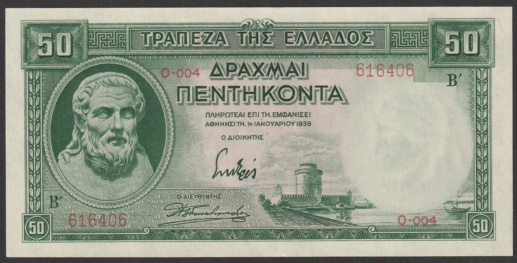 Grecja 50 drachm 1939 - stan bankowy UNC