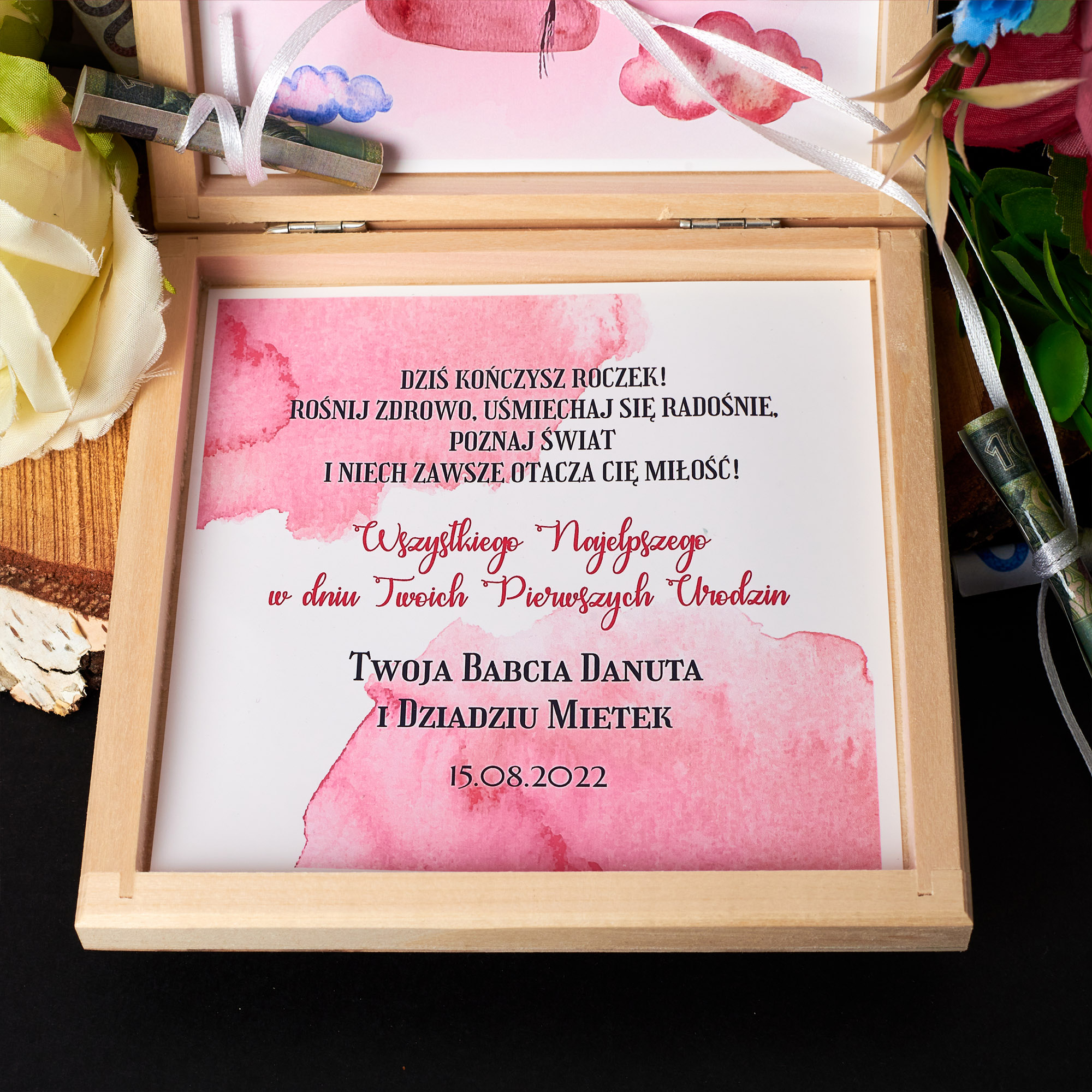 Унікальна та неповторна скринька в якій гроші на ниточці! Це оригінальний подарунок як для хлопчиків, так і для дівчаток, які досягають першого року життя. Це буде незабутній і довговічний подарунок, ідеально підходить для такої важливої події. Це точно відобразить унікальний характер цієї події. На кришці коробочкигравірування, а всередині два аркуші паперу. Один із побажаннями для дитини , а інший із зображеннями повітряних кульок із прикріпленою стрічкою, до якої можна прив’язати згорнуті гроші.