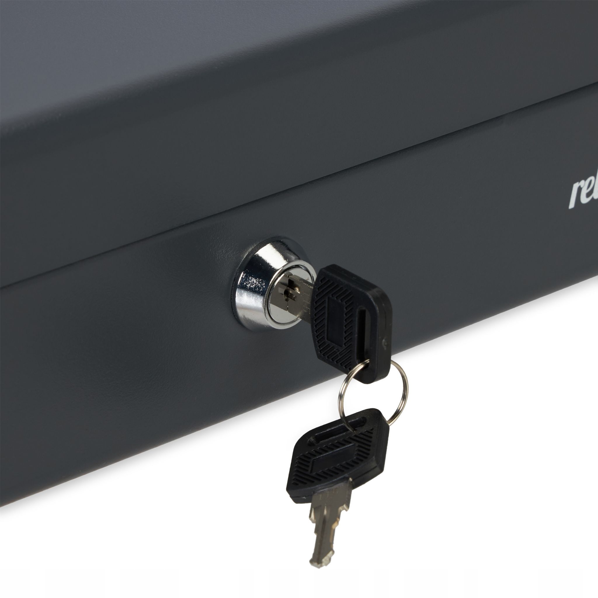 Завжди контролюйте свої грошові кошти завдяки цьому касі. Ви можете сортувати решту відповідно до значення на знімній таблиці для підрахунку монет. Банкноти можна поставити на 3 відсіки касети на монетах. Завдяки твердій сталевій конструкції та вставці, що блокують ваші гроші, вони в безпеці. Завдяки ручці, коробка для монет також ідеально підходить для ярмарків, вечірок або базара з тортами. Грошова касета також може виступати в ролі клубної або командної касети.