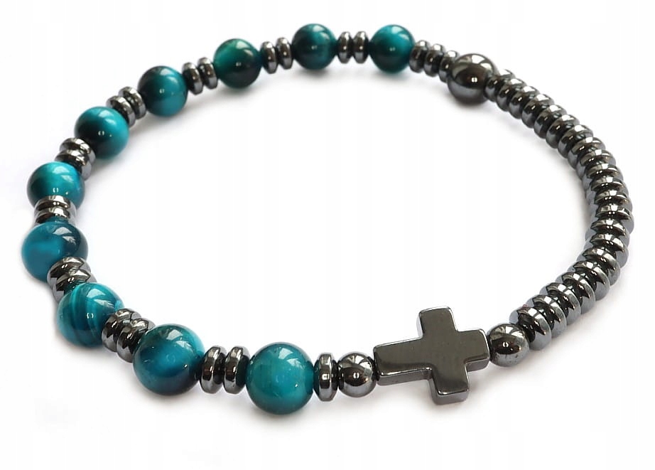 Виготовлений з бірюзових каменів тигрового ока та графітового гематиту.