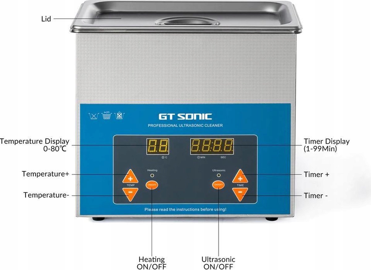 - Ультразвукова мийка GT SONIC використовує потужний, надійний генератор 100 Вт, 40 кГц, який забезпечує високу вихідну потужність і чудову стабільність. Бак для прання виготовлено з нержавіючої сталі SUS304 товщиною 0,04 дюйма (1 мм) із тисненим покриттям у традиційному стилі, тому вся пральна машина яскрава, надійна та довговічна.
