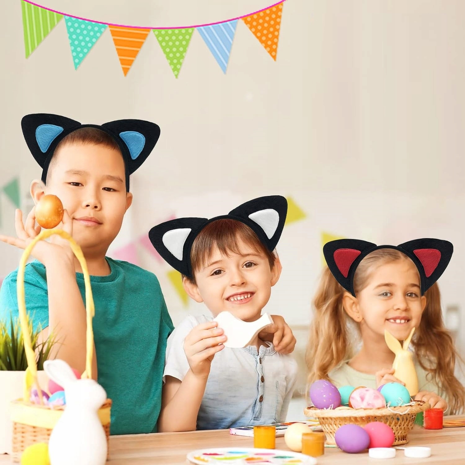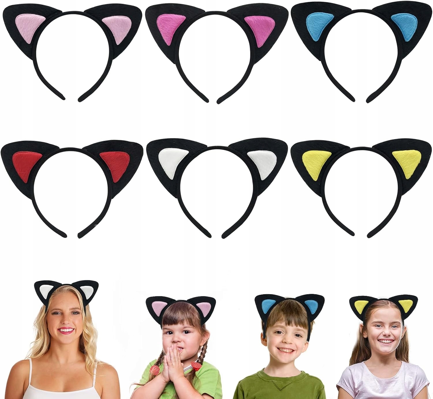 - 6 кольорів: Упаковка містить 6 пов’язок із котячими вушками різних кольорів (світло-рожевий, темно-рожевий, синій, білий, червоний, жовтий).