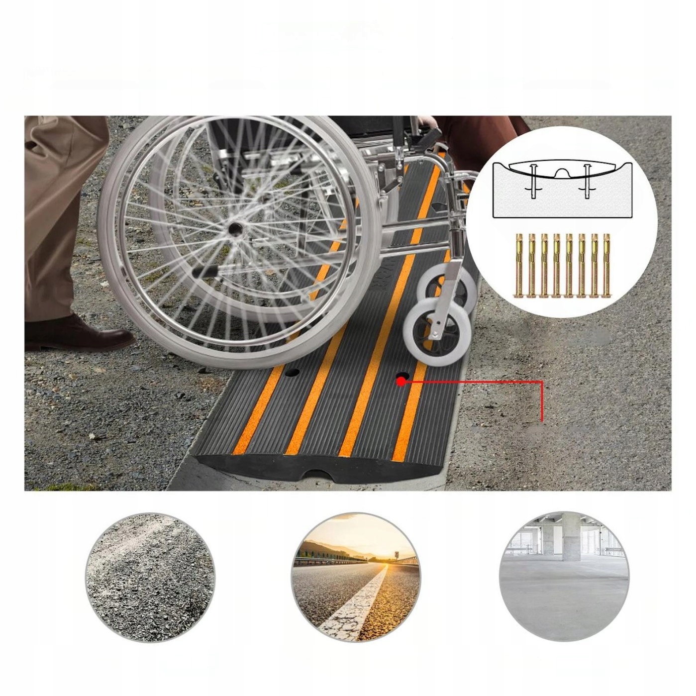 Виріб розроблено для різних розмірів бордюрів та під’їздів. Завдяки цьому користувач може бути впевнений, що пандус можна адаптувати до багатьох типів під’їздів, гаражів та інших місць.