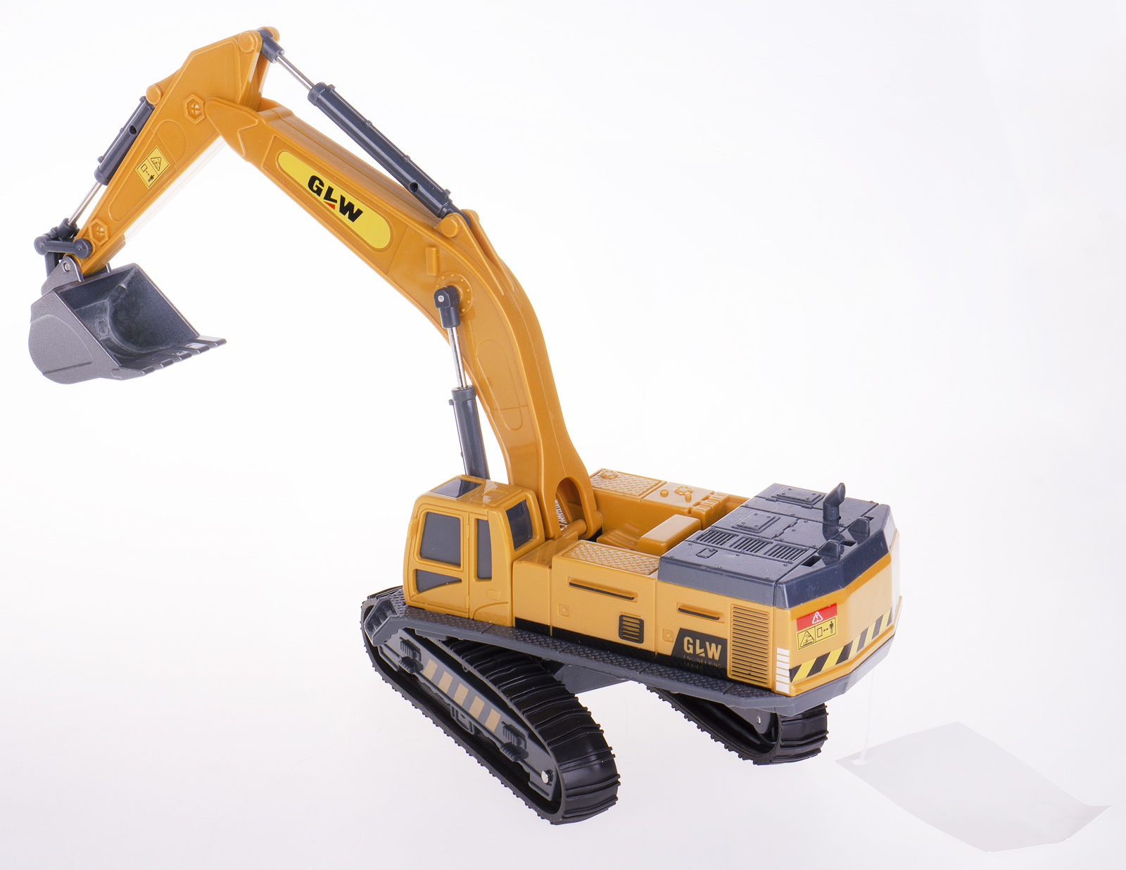 Макет екскаватора з міцного пластику зі стрілою, що закінчується металевою лопатою на гумових гусеницях в масштабі 1:55.