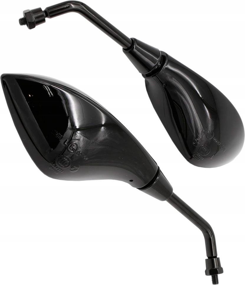 Чорні лаковані дзеркала на міцному металевому з’єднанні, різьбове кріплення М10 із зенкером. Гарна обтічна форма у вигляді сльозинки.