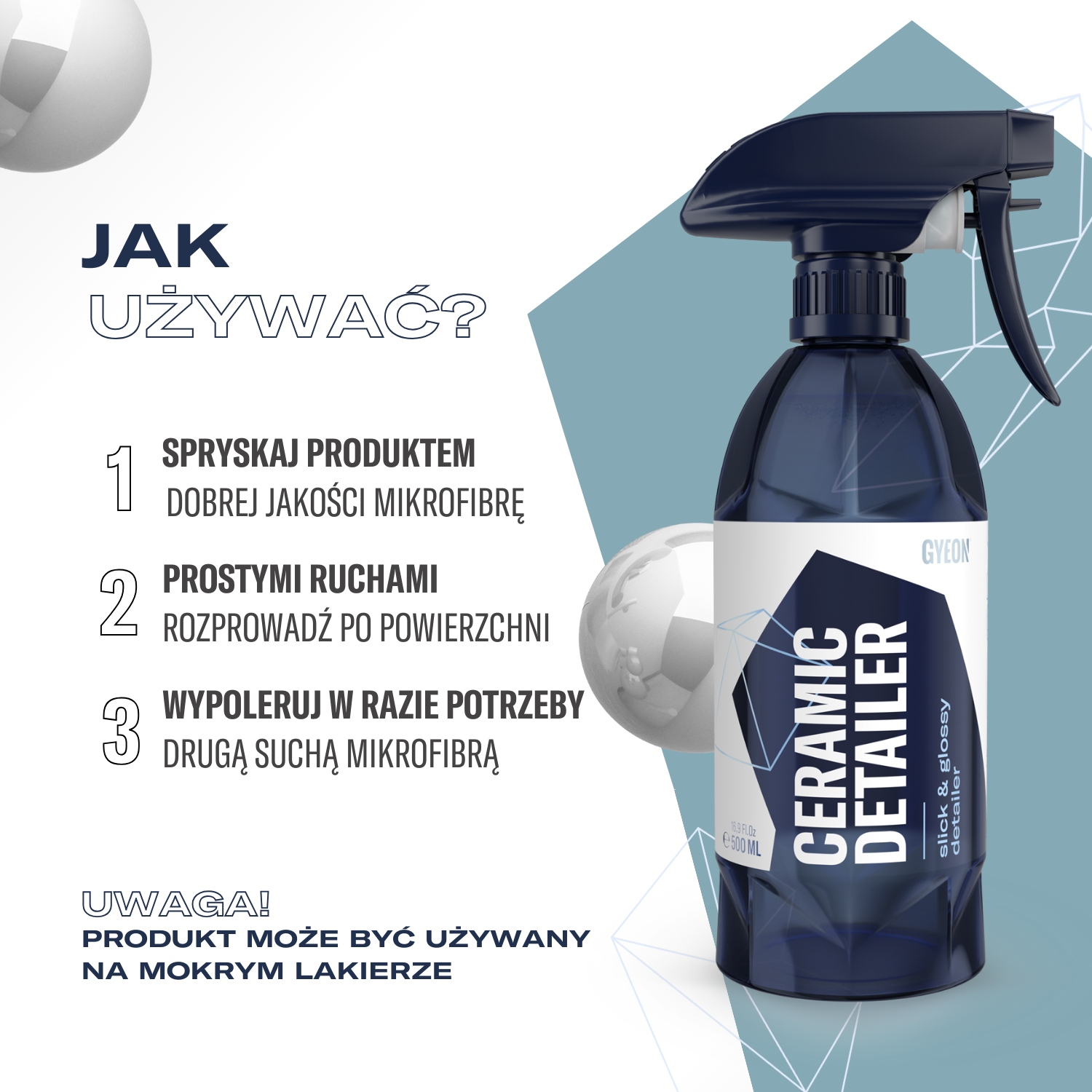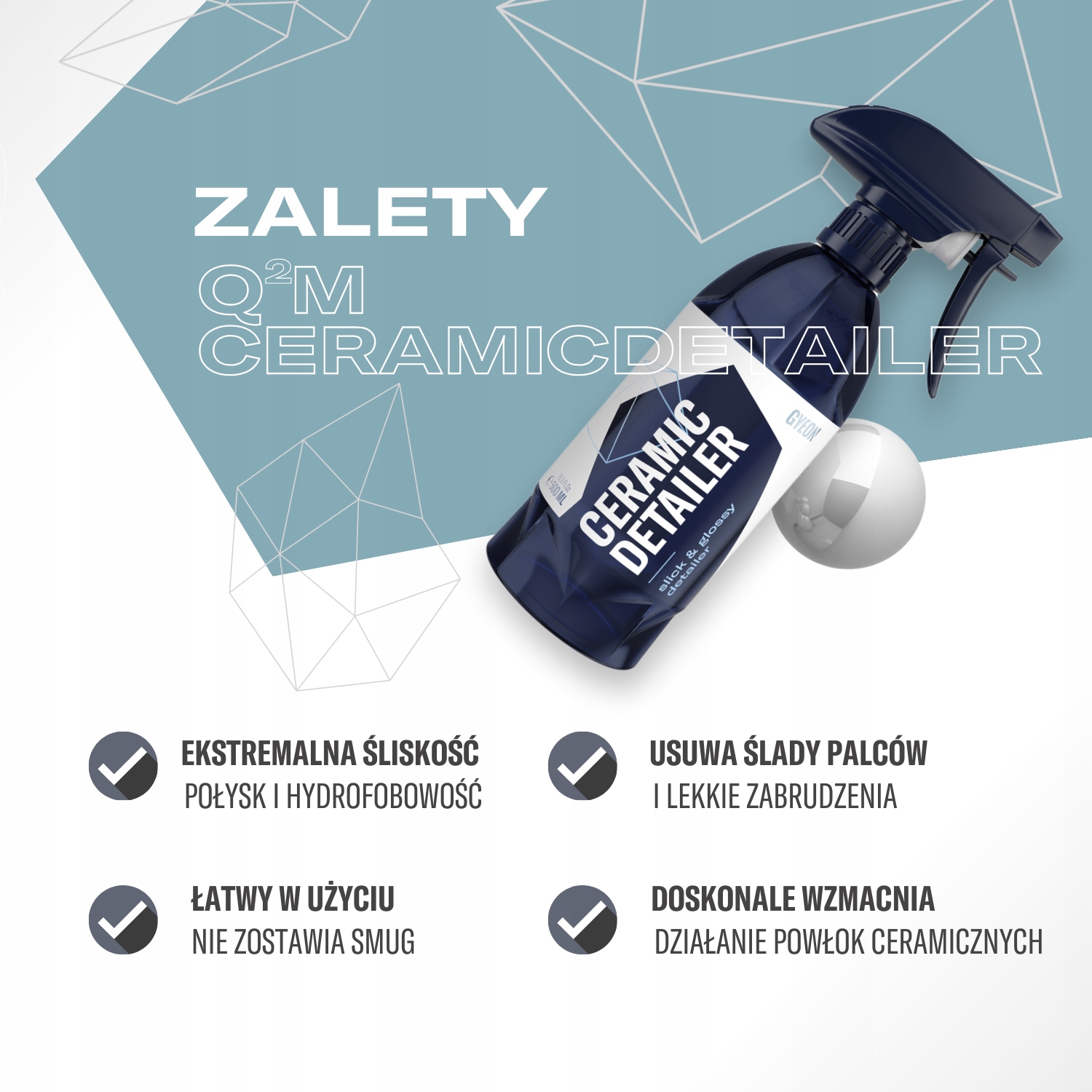 Gyeon Q2M Ceramic Detailder - це відповідь на потреби людей, які піклуються про лак на найвищому рівні. Він може бути використаний як незалежний продукт, спрямований на захист простою лаку, але в кінцевому підсумку він призначений для підтримки та харчування захищених лаків кераміки. Керамічний детер, оброблений автомобілем, відновлює ідеальний зовнішній вигляд та блиск лаку, а також поглиблює колір автомобіля. Завдяки належним чином побудованій формулі керамічної деталі, вона дозволяє здійснити безпеку у відповідному спорті в одному підході.