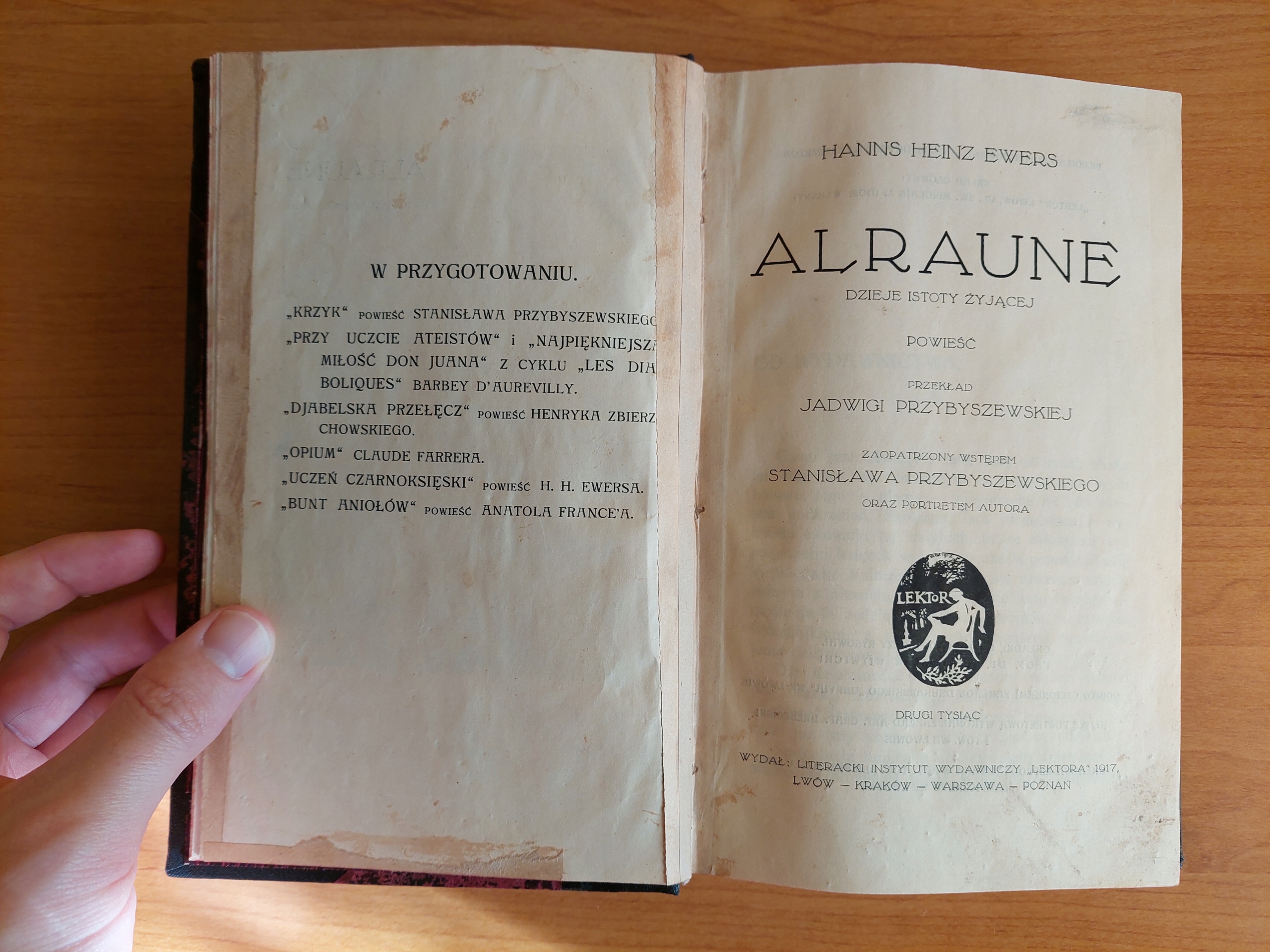 Роман «Alraune. Історія живої істоти" Ганнса Хайнца Еверса. Переклад Ядвіги Пшибишевської зі вступом Станіслава Пшибишевського. Видання 1917 року (друге видання того ж року, що й перше).