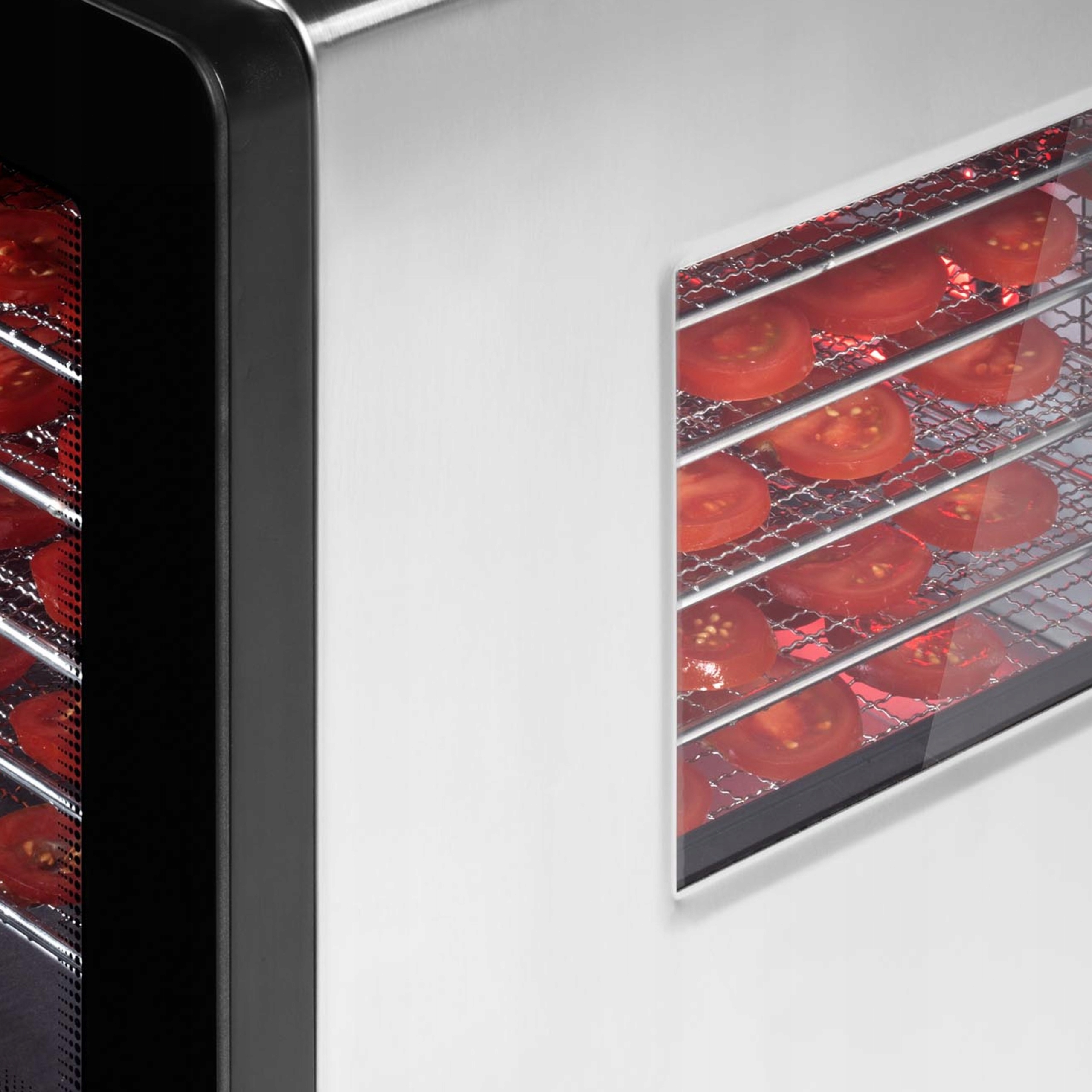 Вхідні двері прозорі, щоб дозволити вільний вигляд інтер’єру. Завдяки цьому можна підтримувати повний контроль над тим, як виглядає процес сушіння, і на якому етапі сухофрукти, м'ясо, гриби та трави. Двері відкриваються таким чином, щоб полегшити видалення та вставку решітків. Вікна також знаходяться збоку, що дає повний перегляд вмісту.