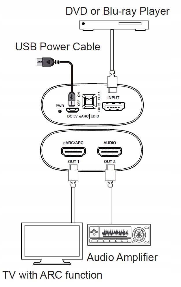 Пам’ятайте, що застосування пристрою може відрізнятися. Використовуючи простий перемикач або розгалужувач, ми можемо легко та за низьку ціну розширити наш домашній кінотеатр, не маючи ARC/eARC-сумісних пристроїв або приймача.