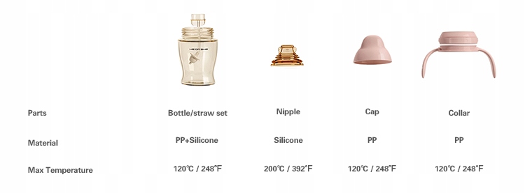 Можна мити в посудомийній машині (поїлка на верхній полиці) і в мікрохвильовій печі (необхідно знайти). У міру того, як ваша дитина росте, і щоб перейти від стадії I до стадії II, вам потрібно буде одночасно змінити мундштук і соломинку.