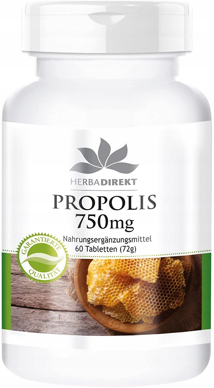 Екстракт прополісу Herbadirekt 750 мг, містить 22,5 мг галангіну, 60 таблеток, без стеарату магнію, без лактози, без фруктози, без глютену, без дріжджів, без желатину