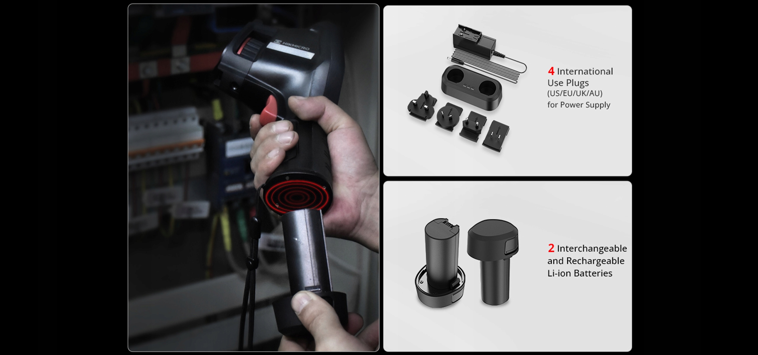 містить 2 замінні літій-іонні акумулятори та двоногий зарядний пристрій, який забезпечить вам до 12 годин роботи. Це дозволяє зберегти джерело живлення навіть під час найдовших перевірок.