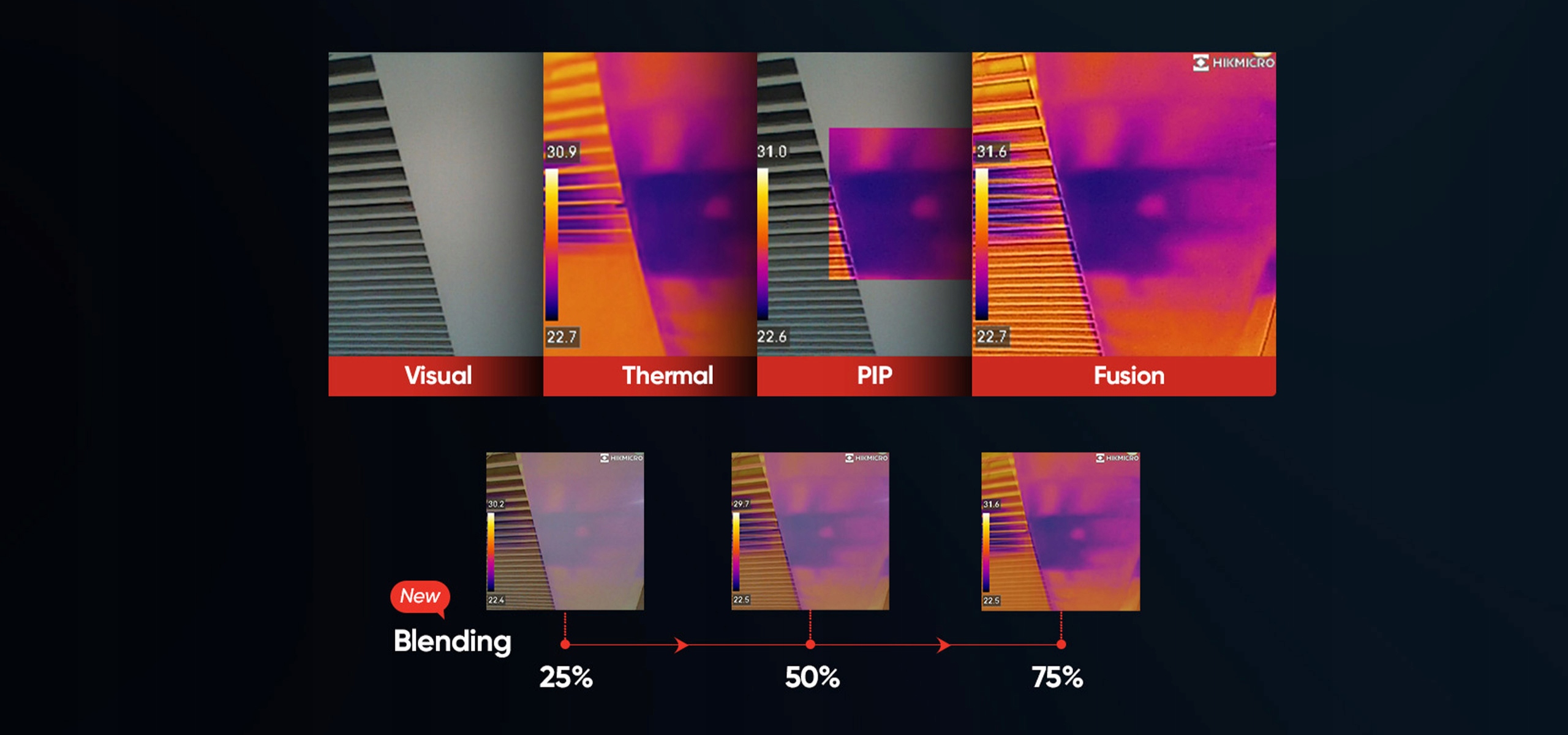 побудована -in теплова візуальна камера та оптична камера дозволяють перемикати 5 режимів зображення (теплові, оптичні, PIP, Fusion та Mixing). "Fusion" поєднує в собі ключові деталі з оптичної камери з роздільною здатністю 0,3 мільйона пікселів з інфрачервоним зображенням, додаючи деталі та чіткість. "Підключення" подає частково прозорі інфрачервоні та оптичні зображення в одне зображення і дозволяє адаптувати прозорість. "PIP" накладає фіксовану частину теплового зображення на цифрову фотографію, щоб уточнити розташування аномалії.