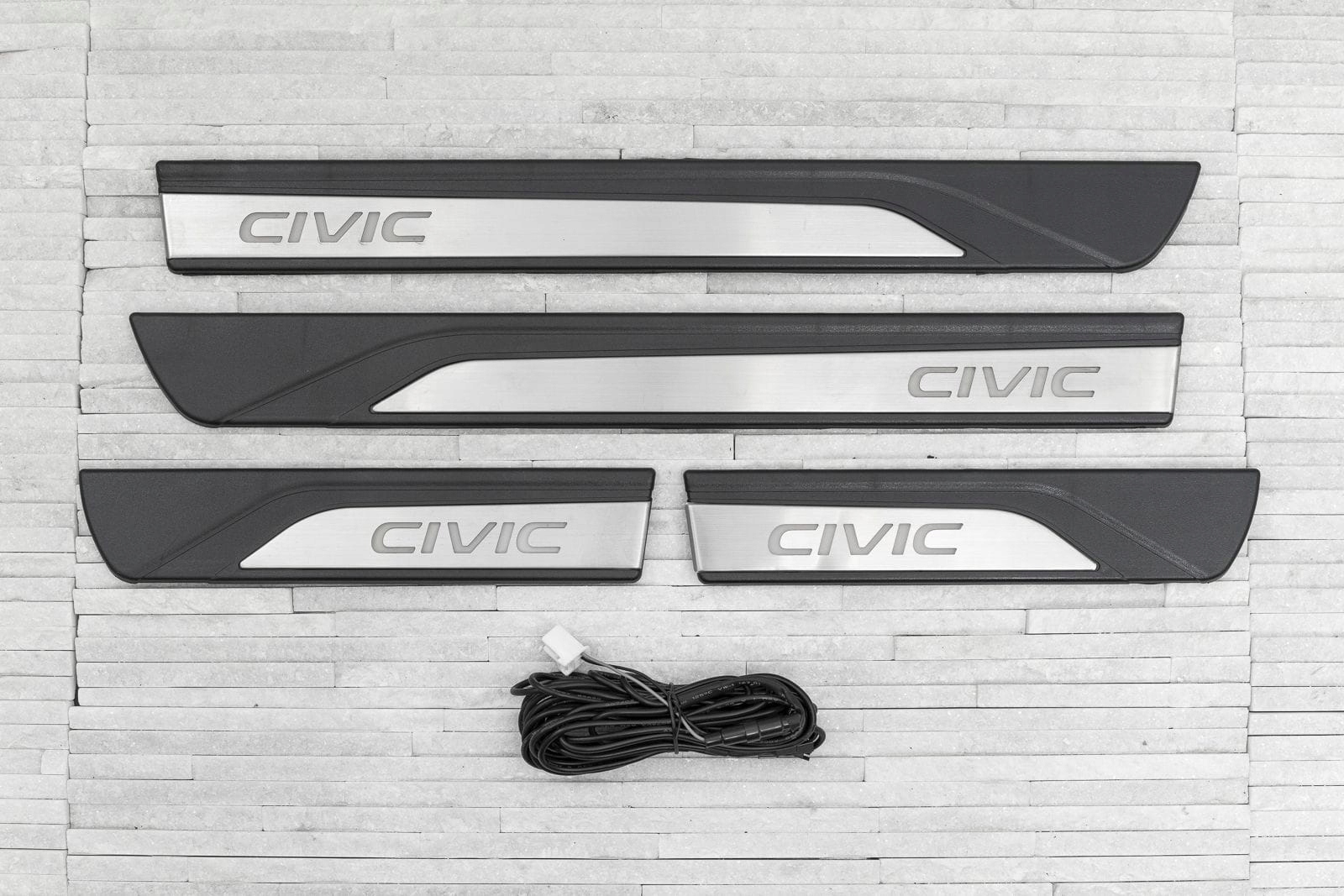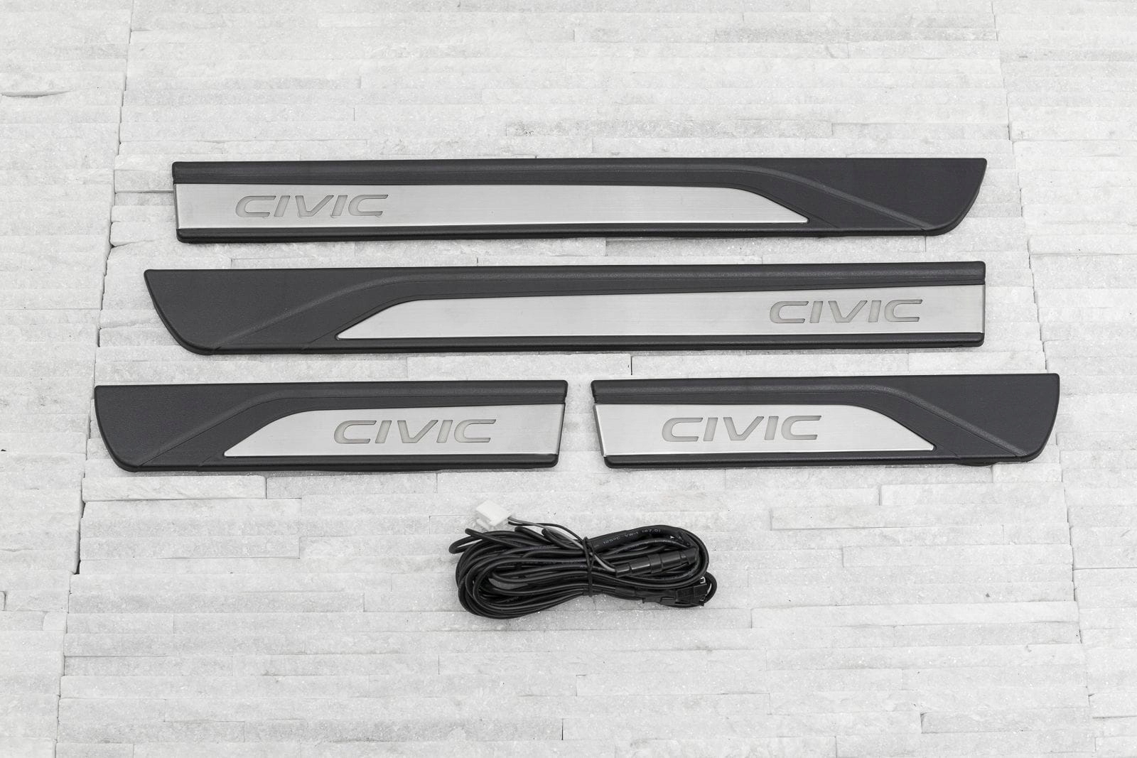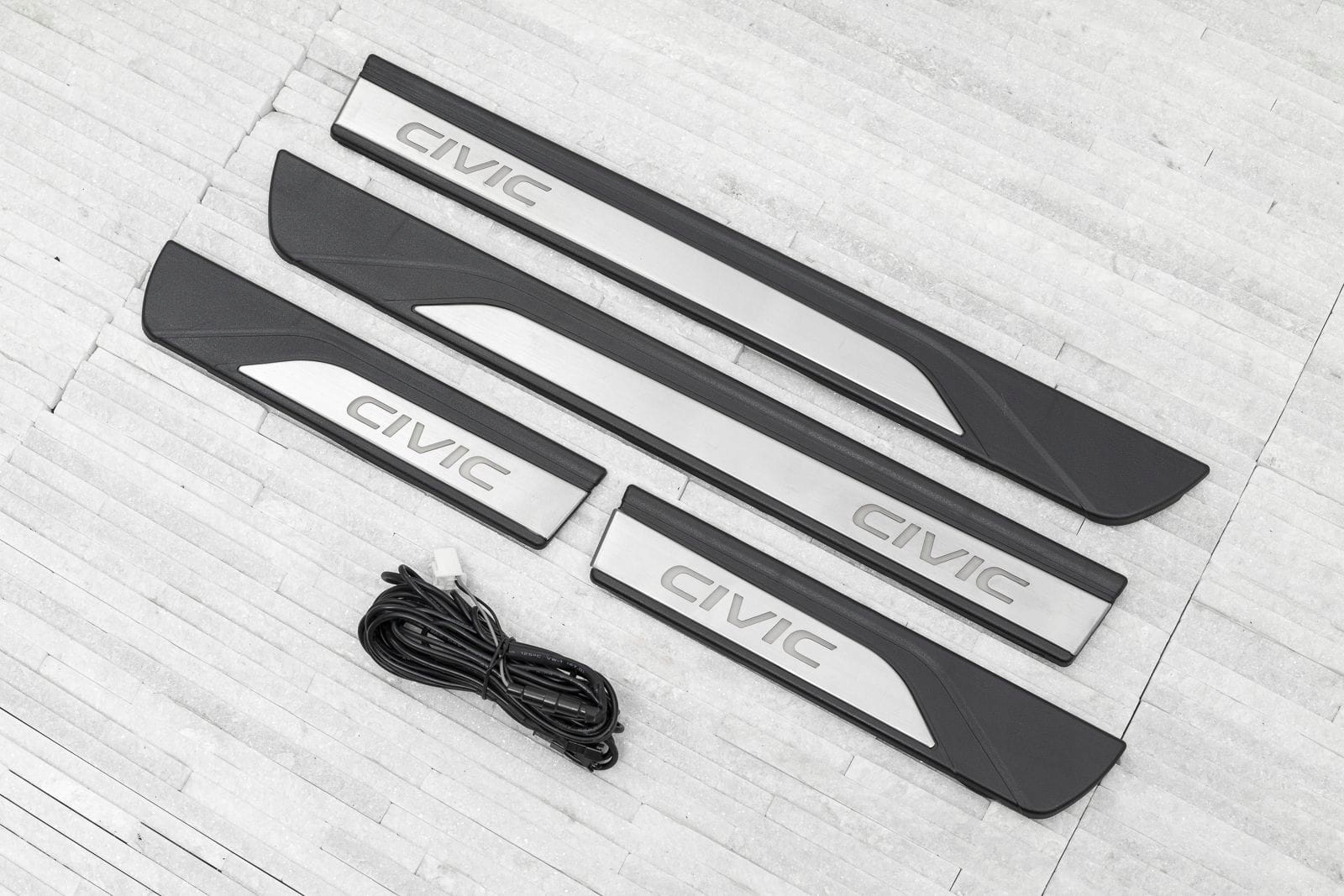 Планки кріпляться на пофарбовані частини внутрішніх порогів. Вони доповнюють внутрішню лінію дверей і надають поріжку спортивно-елегантний вигляд. Дана модель привертає увагу декоративним підсвіченим написом CIVIC. Завдяки вбудованому світлодіодному освітленню елемент не тільки підкреслює сучасний стиль автомобіля, але й підсвічує зону порогів, полегшуючи посадку та вихід.