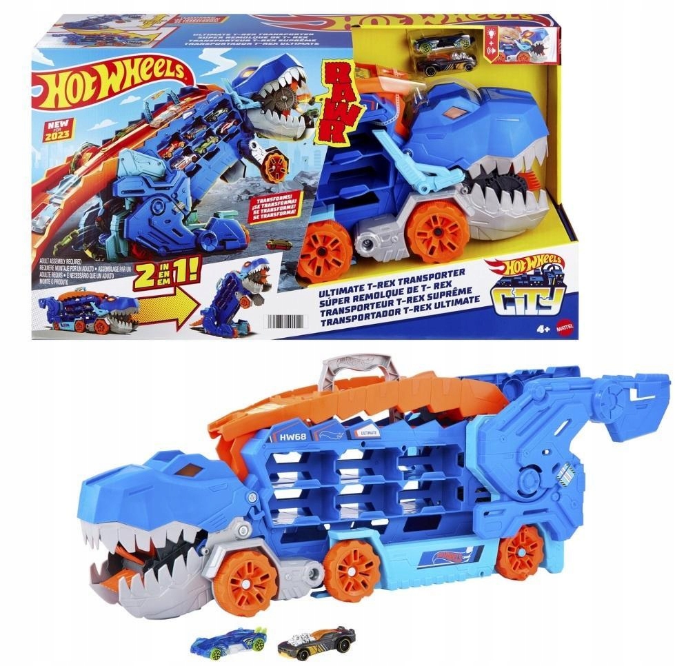 Набір T-Rex Mega Transporter містить 2 автомобілі з гарячими колесами (R) за шкалою 1:64, що робить його чудовим подарунком для дітей віком від 4 років.