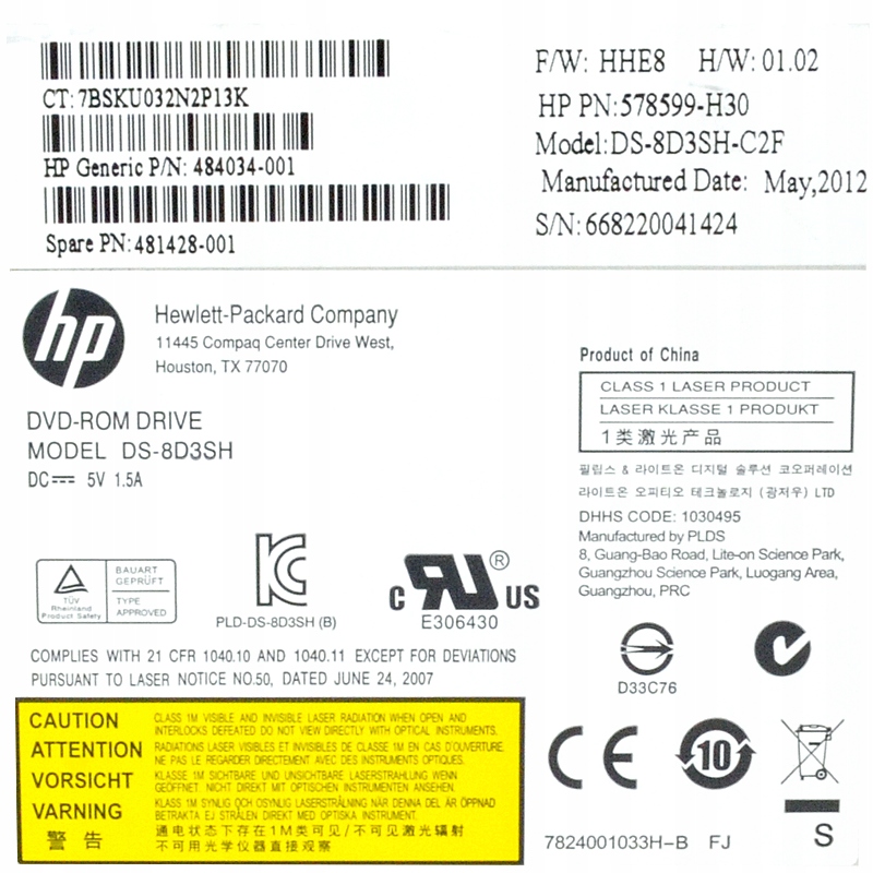 HP DS-8D3SH-C2F 484034-001 578599-H30 CD DVD ROM