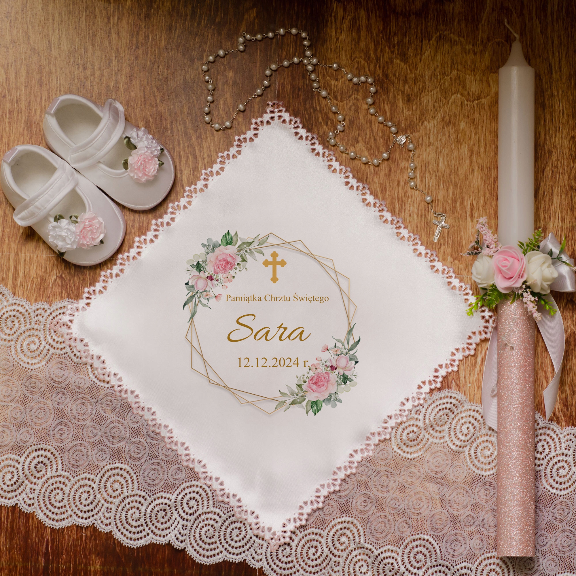 Ще один елемент набору - це унікальний, персоналізований халат хрещення, який стане прекрасним сувеніром і символом цього особливого дня. Халат має вимір: 26см x 26 см і персоналізований.