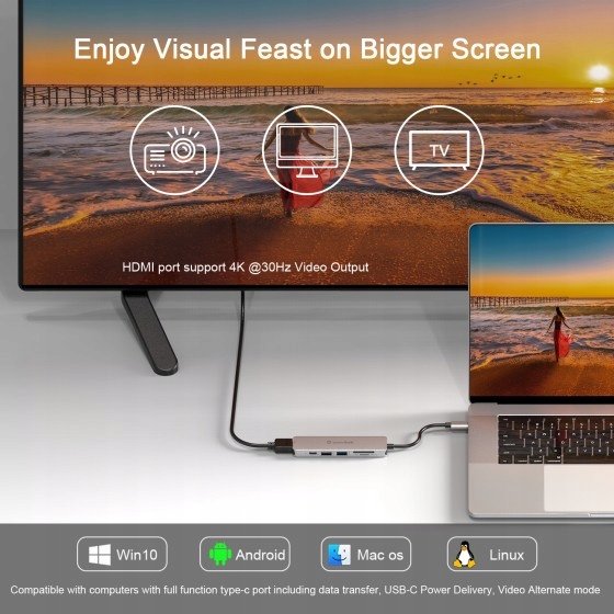 множинний адаптер Wavlink USB C надає всі порти, необхідні для роботи чи домашнього життя. Підключіть багато пристроїв, включаючи зовнішні жорсткі диски, клавіатури та флеш -накопичувачі, щоб отримати максимальну продуктивність. Зчитувач карт SD TF дозволяє робити фотографії з цифрового дзеркала та редагувати їх по телефону. Порт HDMI 4K забезпечує приголомшливе візуальне свято, а живісний порт дозволяє швидко підключити джерело живлення PD під час використання інших портів.