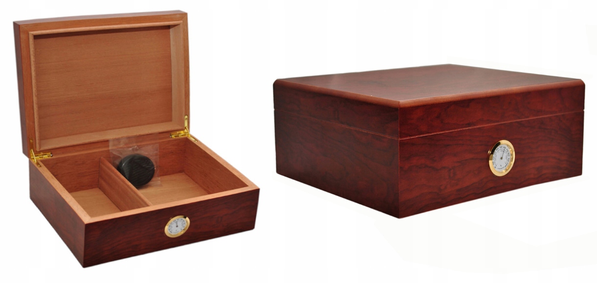 У шпон х'юмідора вбудовано гігрометр. , а в комплект входить зволожувач і розсувна перегородка.