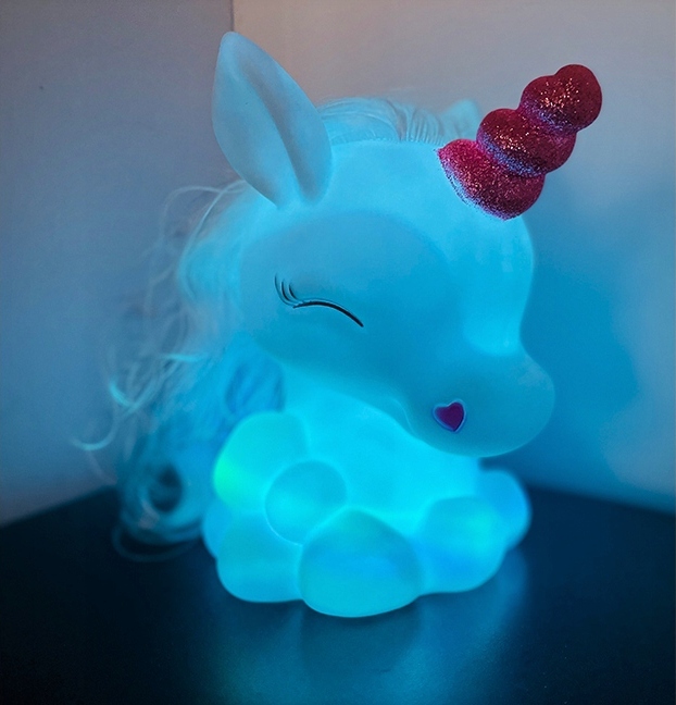 - Лампа-єдиноріг — ідеальний продукт для дітей, які бояться темряви. Він оснащений світлодіодним освітленням, створюючи барвисте, дружнє світло, яке дозволяє вашій дитині спокійно заснути.